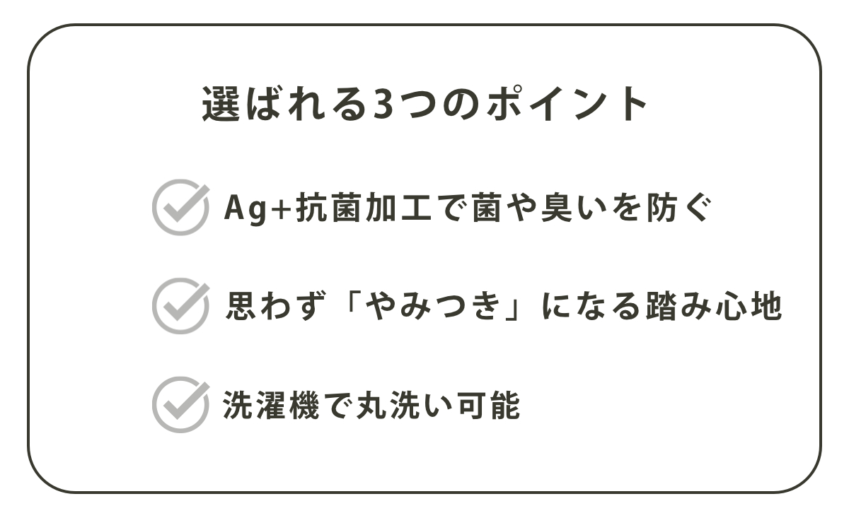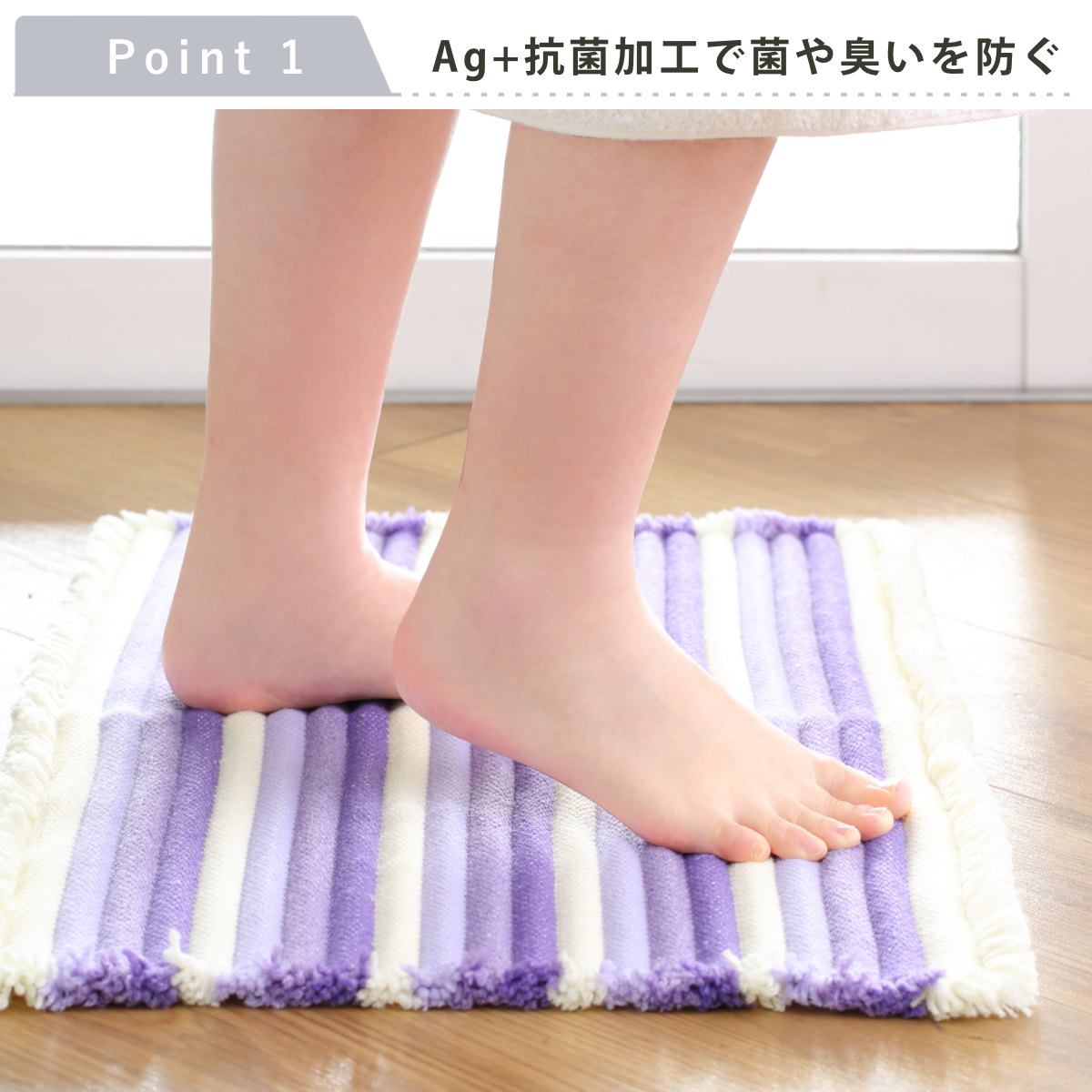 思わずうっとりする踏み心地のバスマットです。銀イオンの抗菌・防臭・消臭加工付きで菌・ニオイをブロックし、いつでも清潔にご使用いただけます。洗濯後も効果が持続するので安心です。また吸水効果にも優れています。