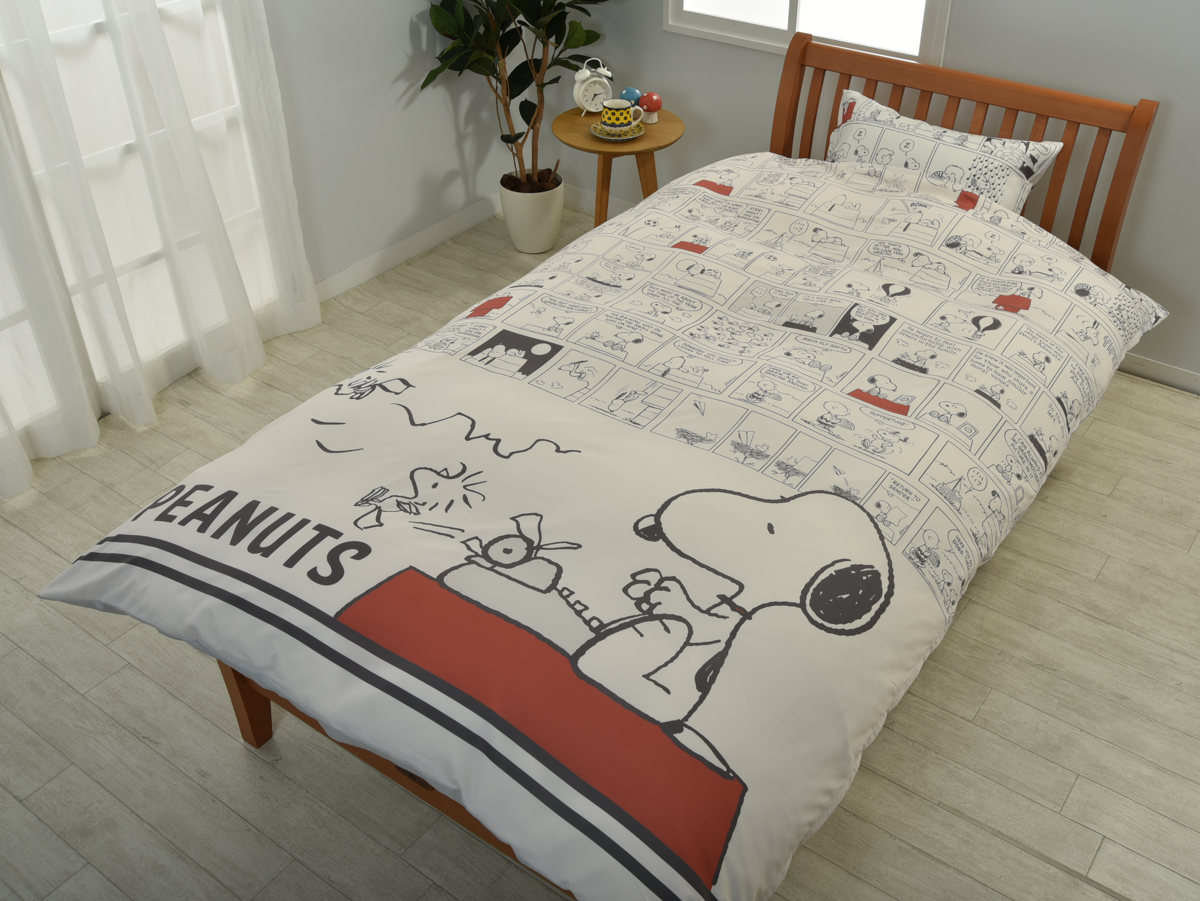 スヌーピーがドッグハウスの屋根の上で、タイプライターを打つ可愛らしい姿と、アニメの1コマを切り取ったようなイラストが、スヌーピーファンにはたまらない掛け布団カバーです。寝室はもちろん、デザインが可愛いので子供部屋にもおすすめです。