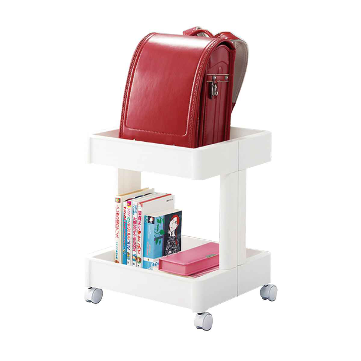 支柱が中心にあるので両サイドから出し入れできる収納ワゴンです。2段タイプで高さ46.8cmなので、お子様のランドセルラックとしても便利です。キッチンはもちろんリビングやランドリールームなど多用途にお使いいただけます。