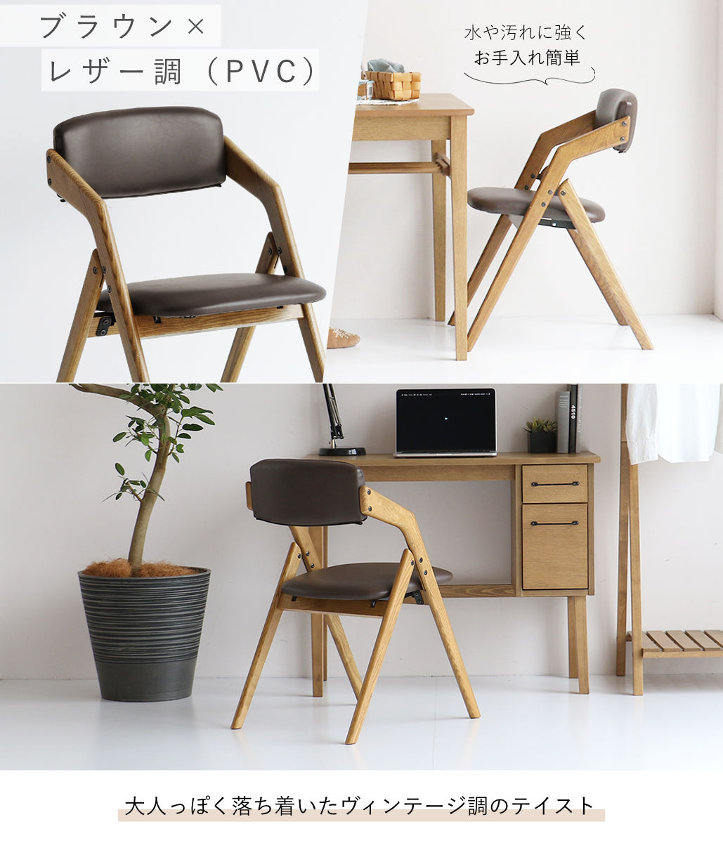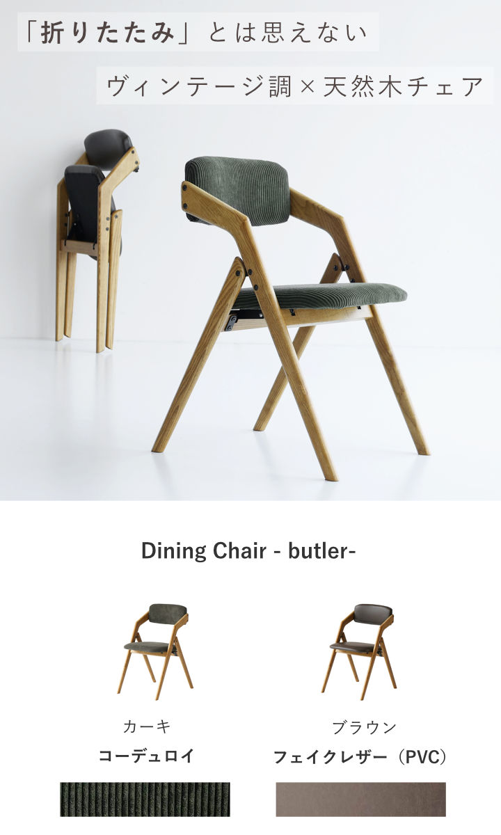 ダイニングチェア 座面高44cm 折りたたみ 肘掛け付き Dining Chair - butler- ( チェア 椅子 リビング 完成品 木製 アッシュ 無垢材 PVC レザー調 ベロア調 コーデュロイ 木目 ) 【ブラウン】
