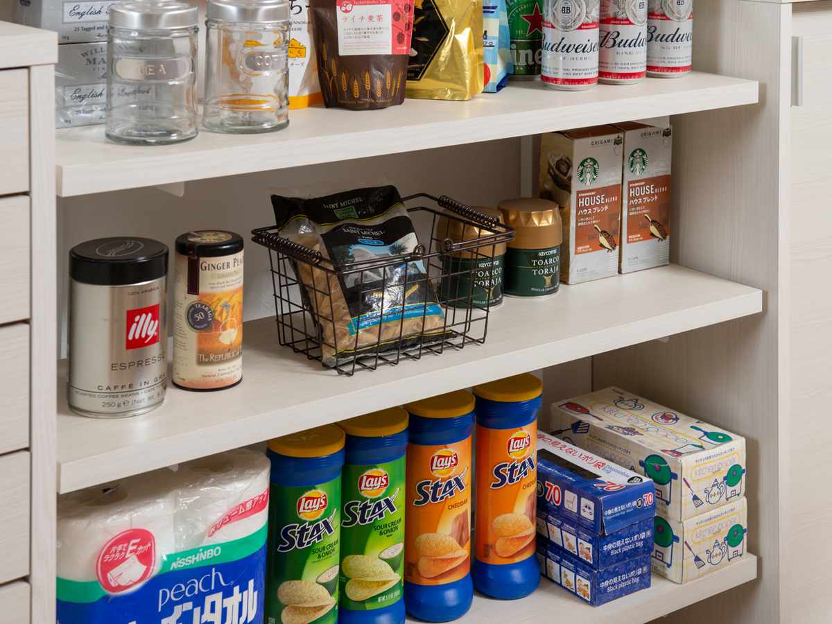 食器やコーヒー、おかしなどの頻繁に出し入れするものから、日用品のストックや本、散らかりがちな小物類などの置き場所に困るものまで、生活スタイルに合わせて自由に収納していただけます。