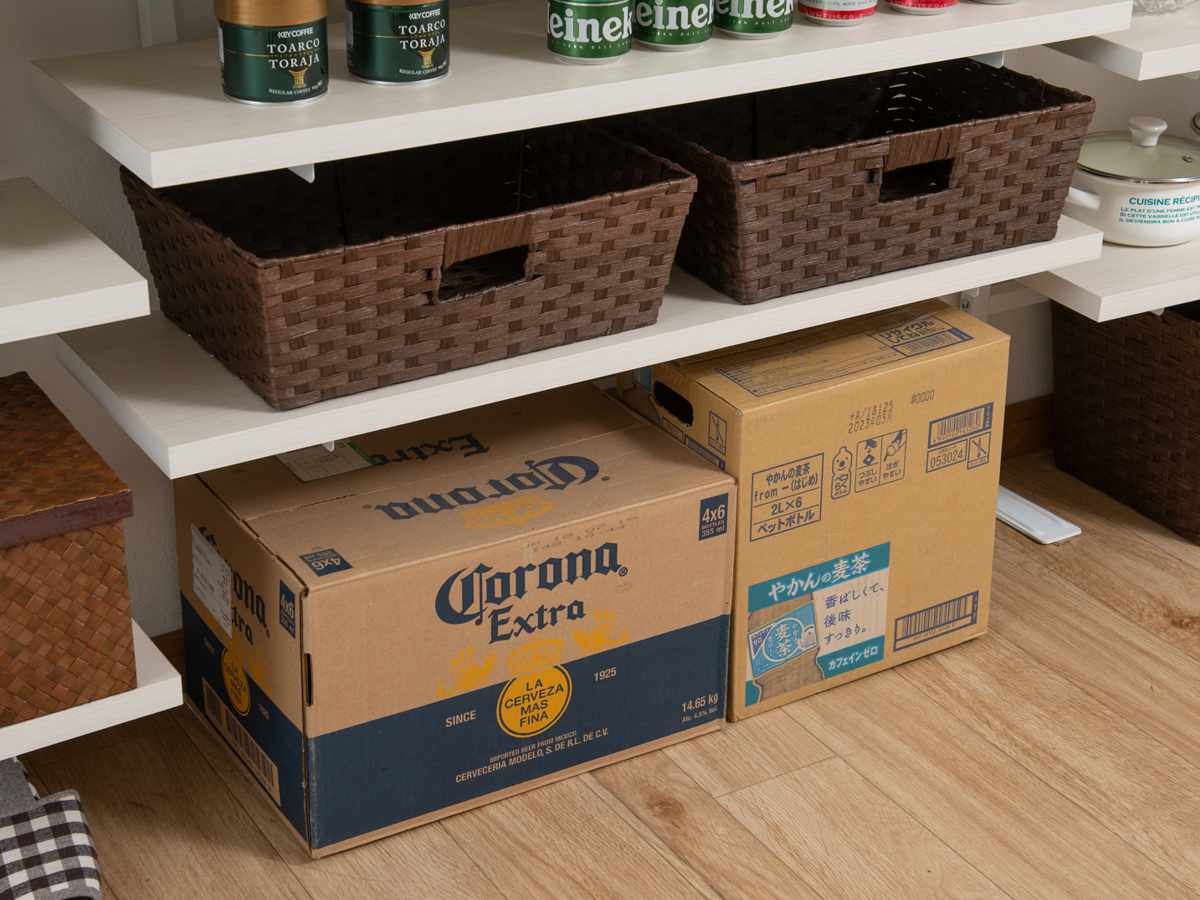 他のサイズのラックや別売りの棚板と組み合わせれば、オリジナルのカウンター下収納を作ることができます。レイアウトも自由に変更でき、カウンター下にたっぷりの収納を増やしながら、圧迫感の少ないスッキリとした空間を実現できます。