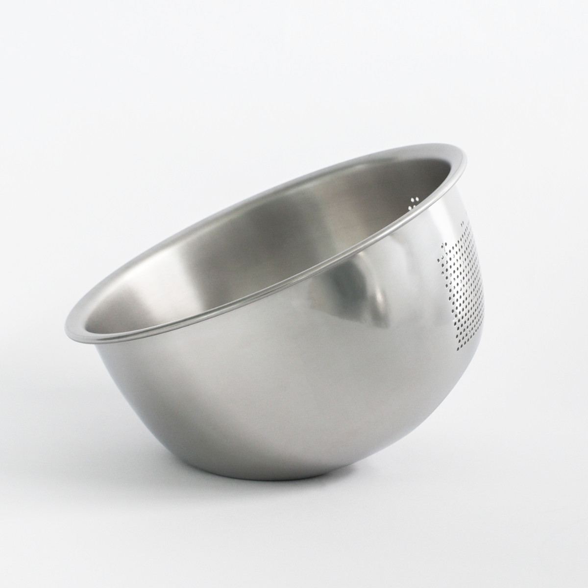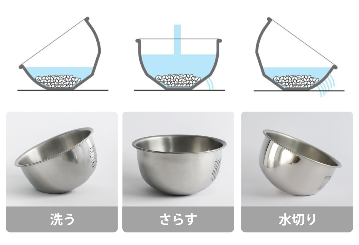 ボウルとザルが一体化した米研ぎボウルです。傾ける方向を変えることで、ボウルとしても水切りザルとしても使用できます。米研ぎの際の「洗う」「さらす」「水切り」がひとつでできます。