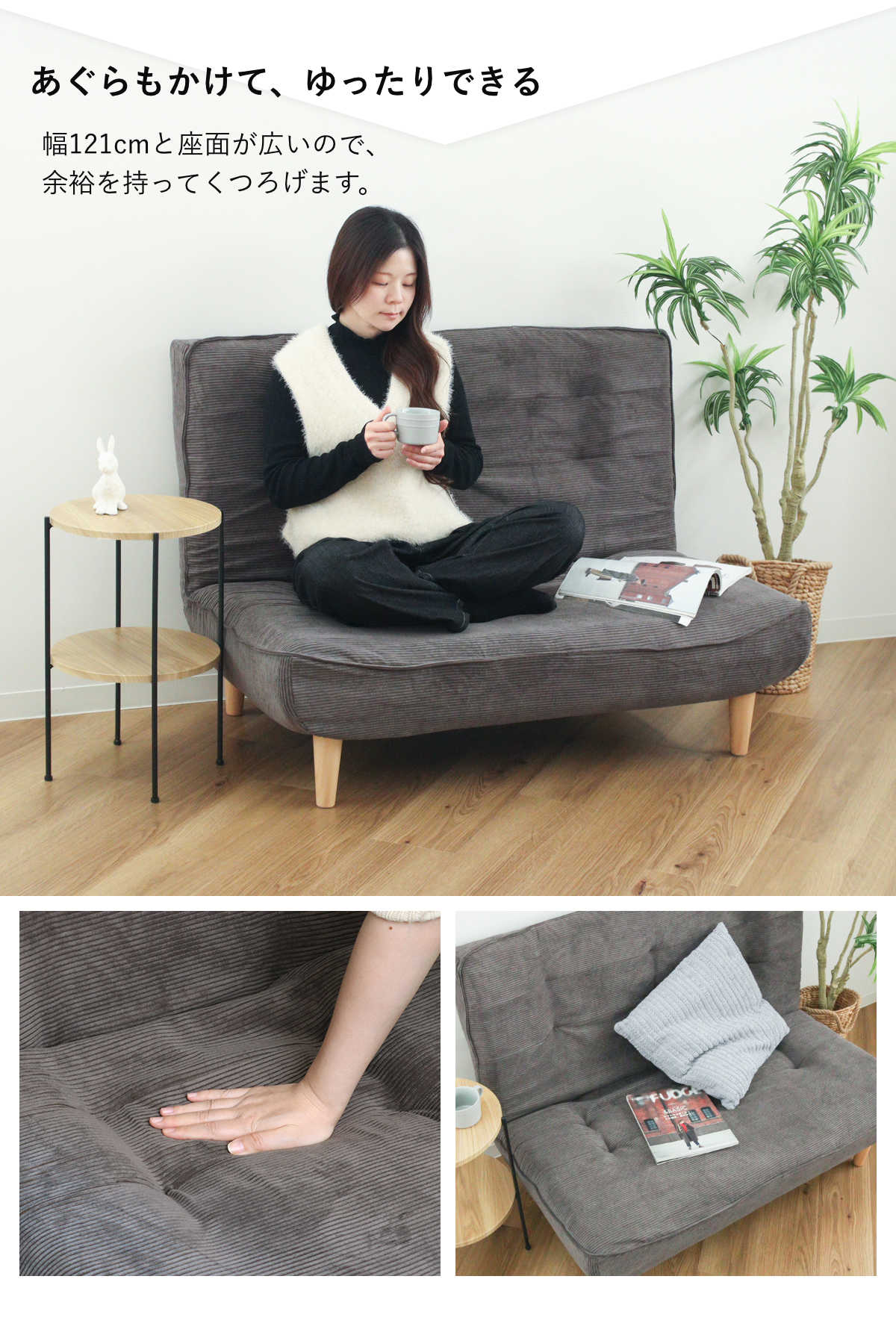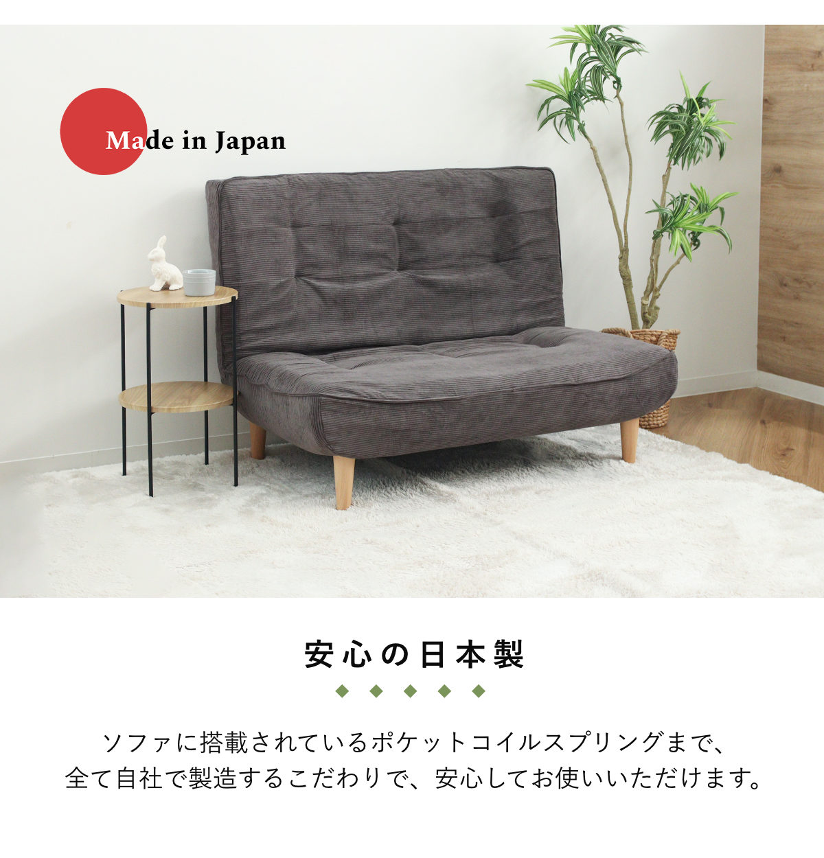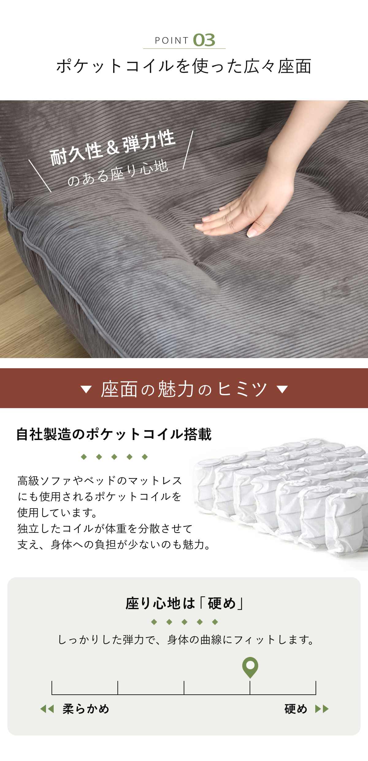 | 材質 | 構造材:スチールパイプ クッション材:ウレタン、ポケットコイルスプリング 生地:ポリエステル91%、ナイロン9% 脚:樹脂 |