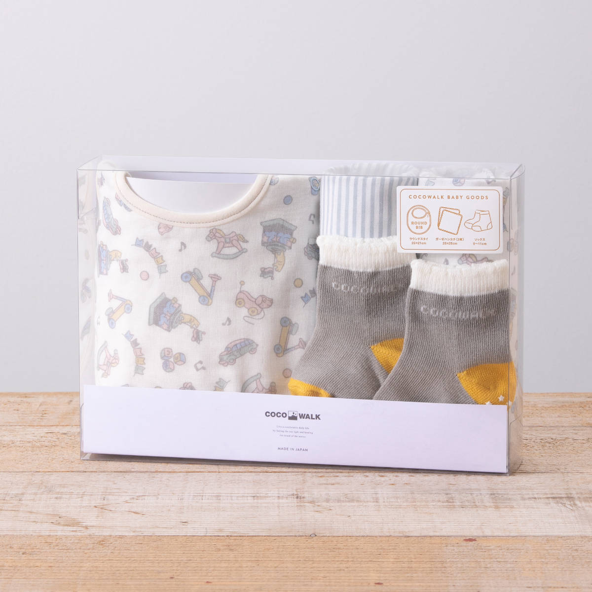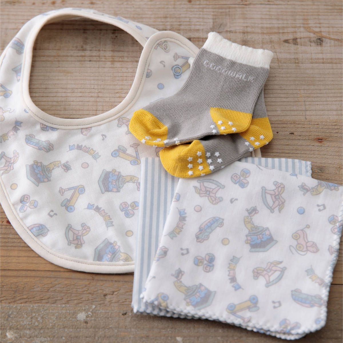 可愛いおもちゃ柄のスタイとハンカチ、ソックスのギフトセット