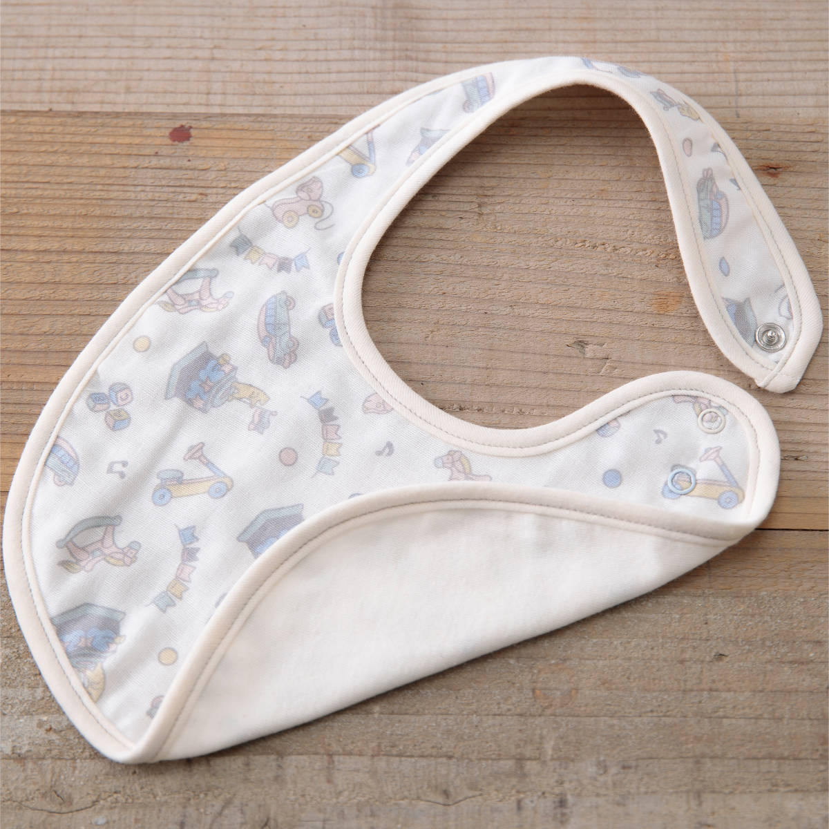横スナップボタン式なので赤ちゃんがねんねしていても簡単に外せます。首回りのサイズに合わせて、2段階に調整可能です。赤ちゃんの汚れた口元を拭いたり、よだれや食べこぼし、飲みこぼししても服が汚れないように衣類を守ります。