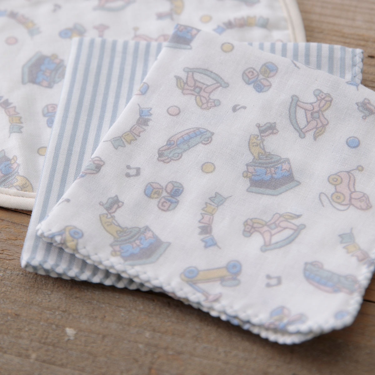 ハンカチはおもちゃ柄とストライプ柄の2枚が入っています。その日のお洋服やシーンに合わせて使い分けができます。また、肌触りの良いガーゼハンカチなので、赤ちゃんの沐浴ガーゼや、お食事タイムのお手拭きとしてもおすすめです。