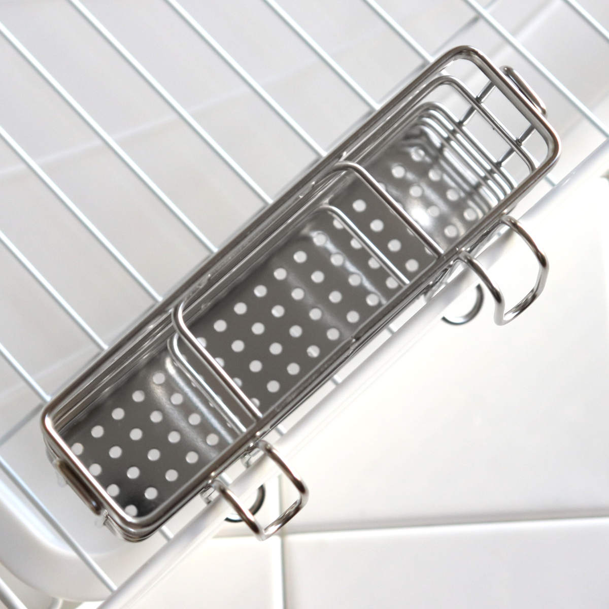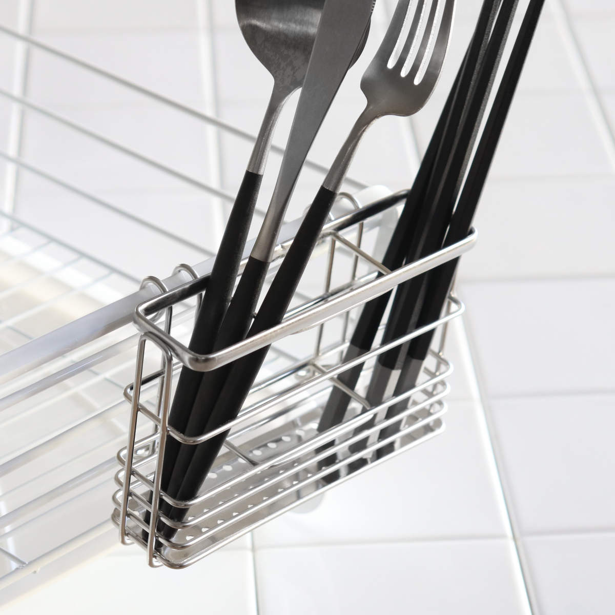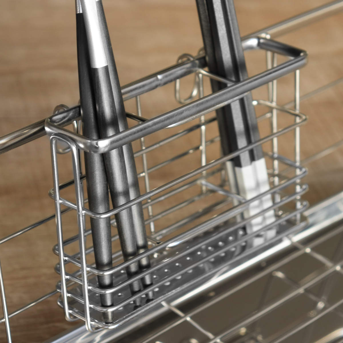 ポケットには、お箸やカトラリーを分別して立てられるように便利な仕切りがついており、内部は3分割されています。底面には、排水の穴が開いたステンレスのプレートが入っているので、お箸などの細いものが底から抜け落ちる心配がありません。