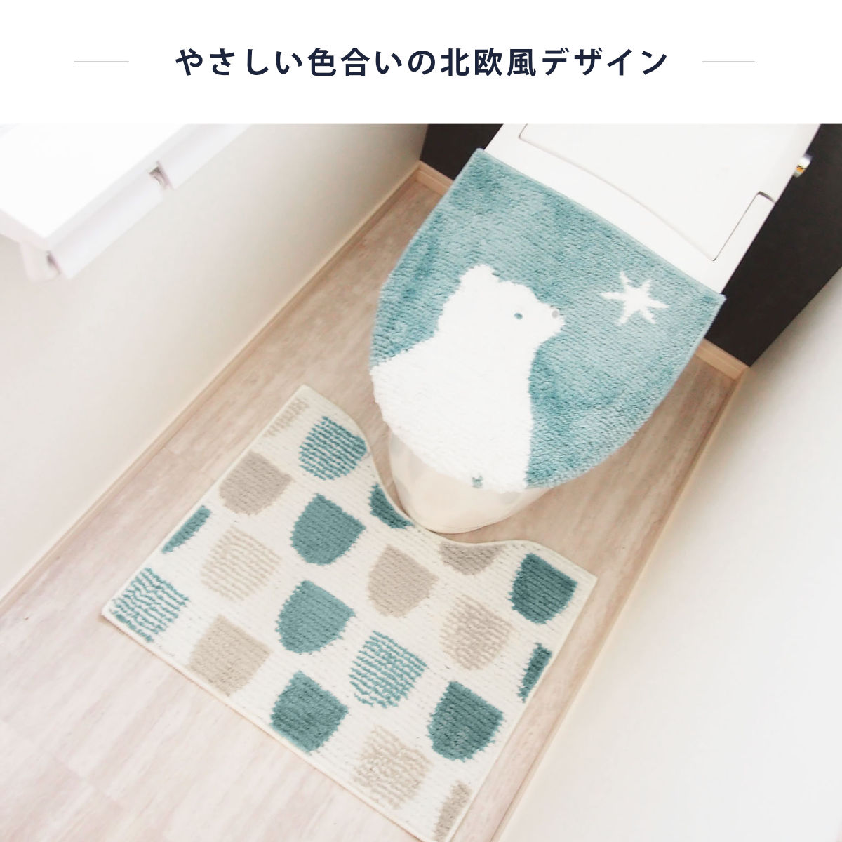 ●やさしい色合いで、あたたかみのある北欧デザインのトイレマット・兼用蓋カバー2点セットです。