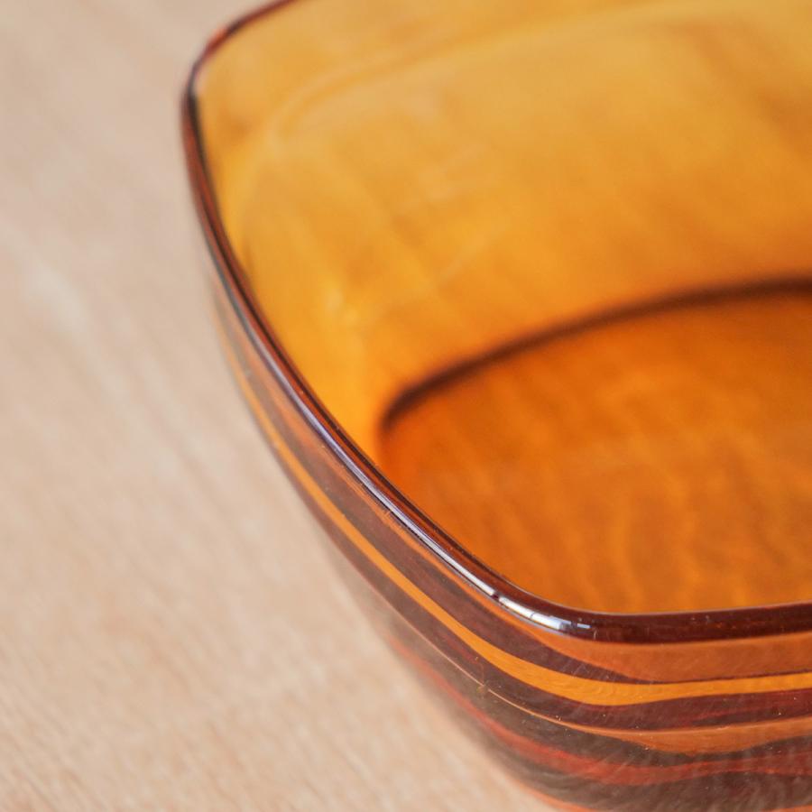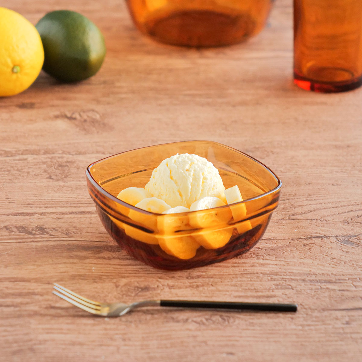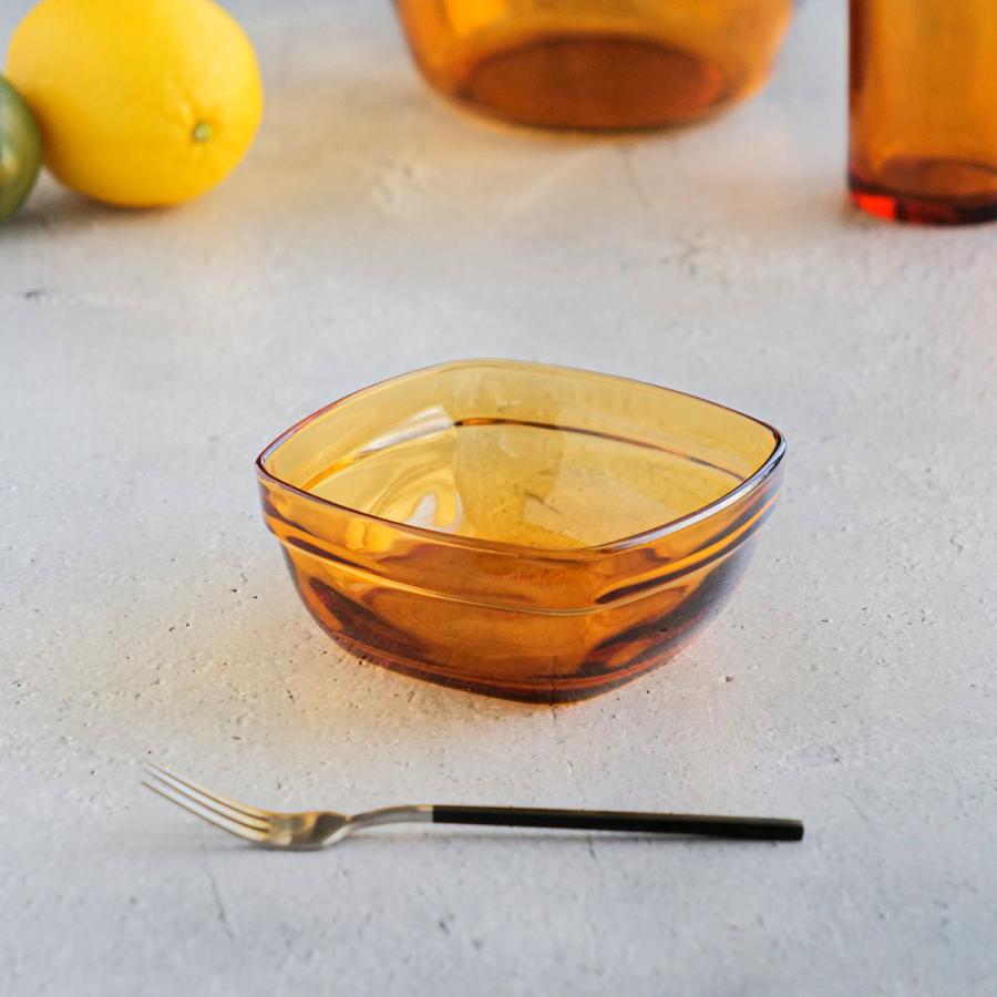 レトロな雰囲気がお洒落なアンバーカラーのボウルです。デザートのアイスやフルーツ、ちょっとしたおつまみなどを盛り付けるのにぴったりなサイズです。
