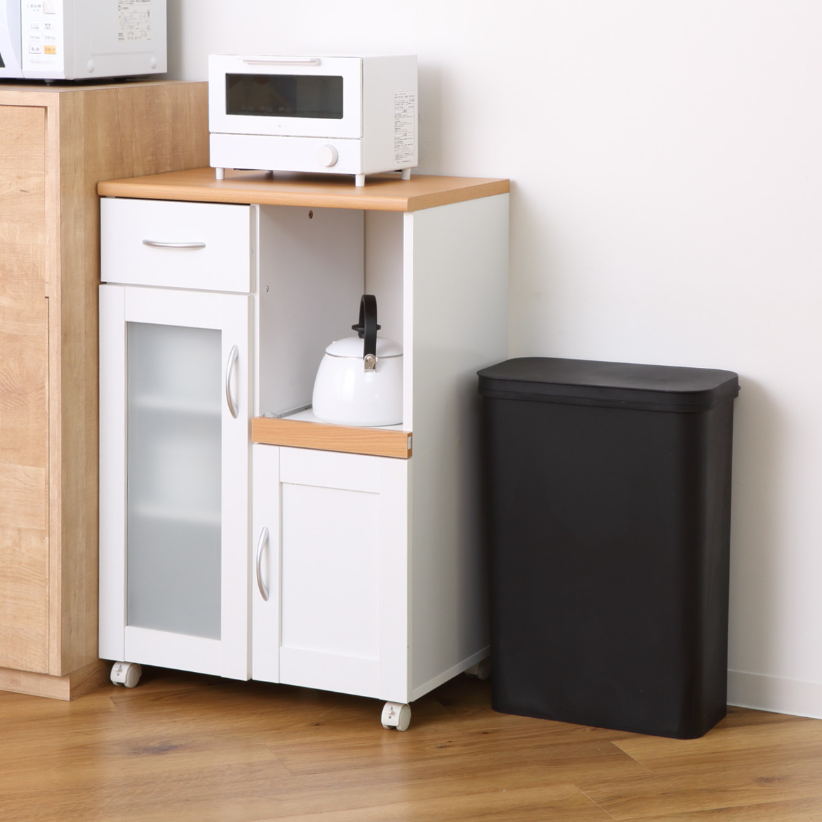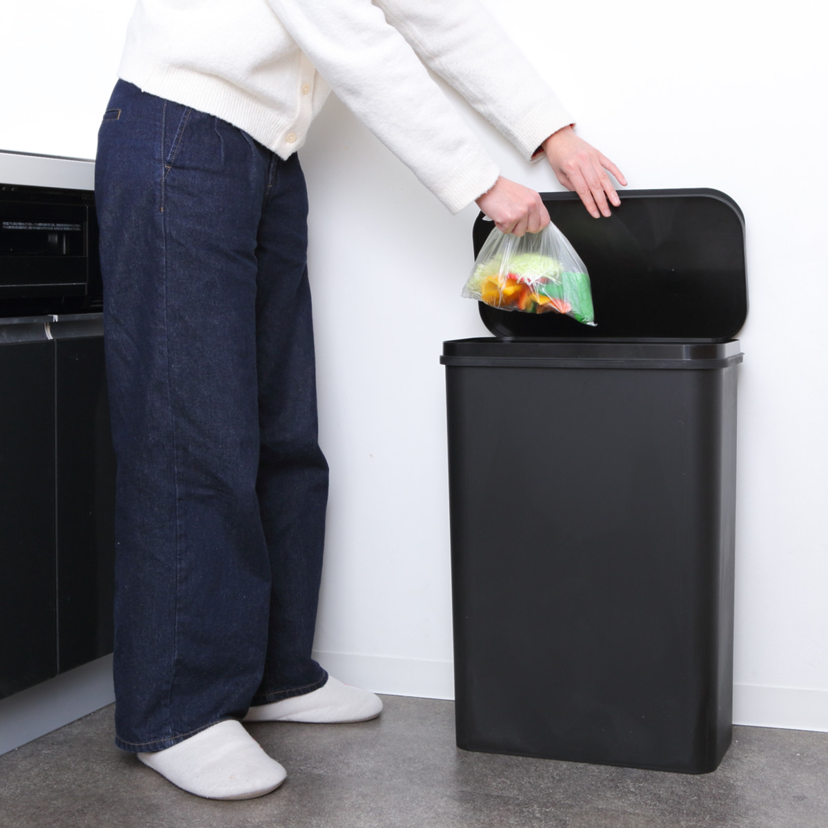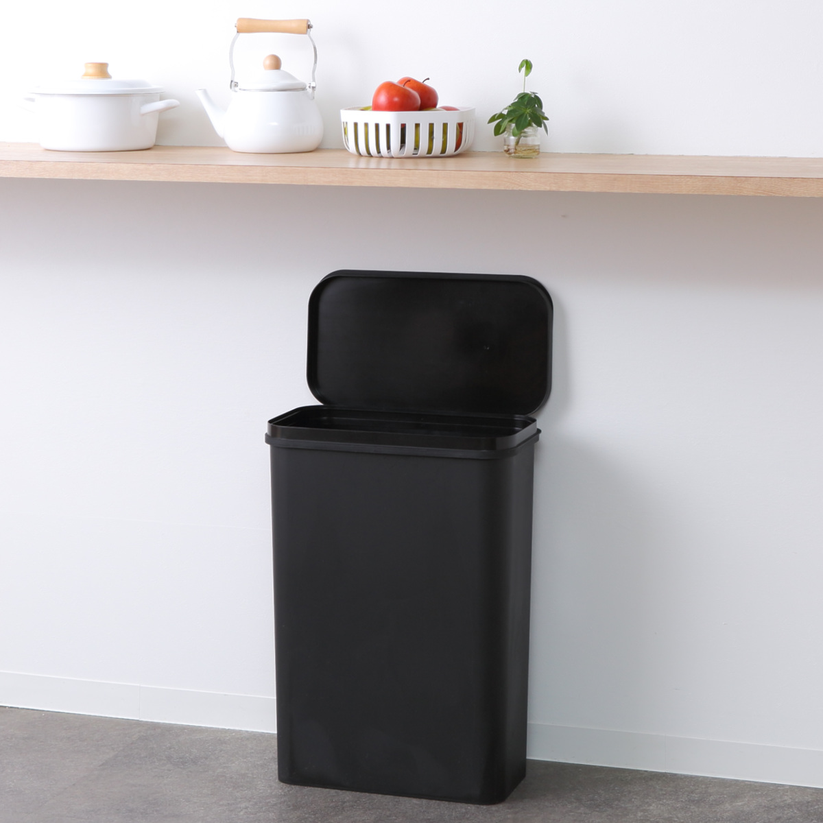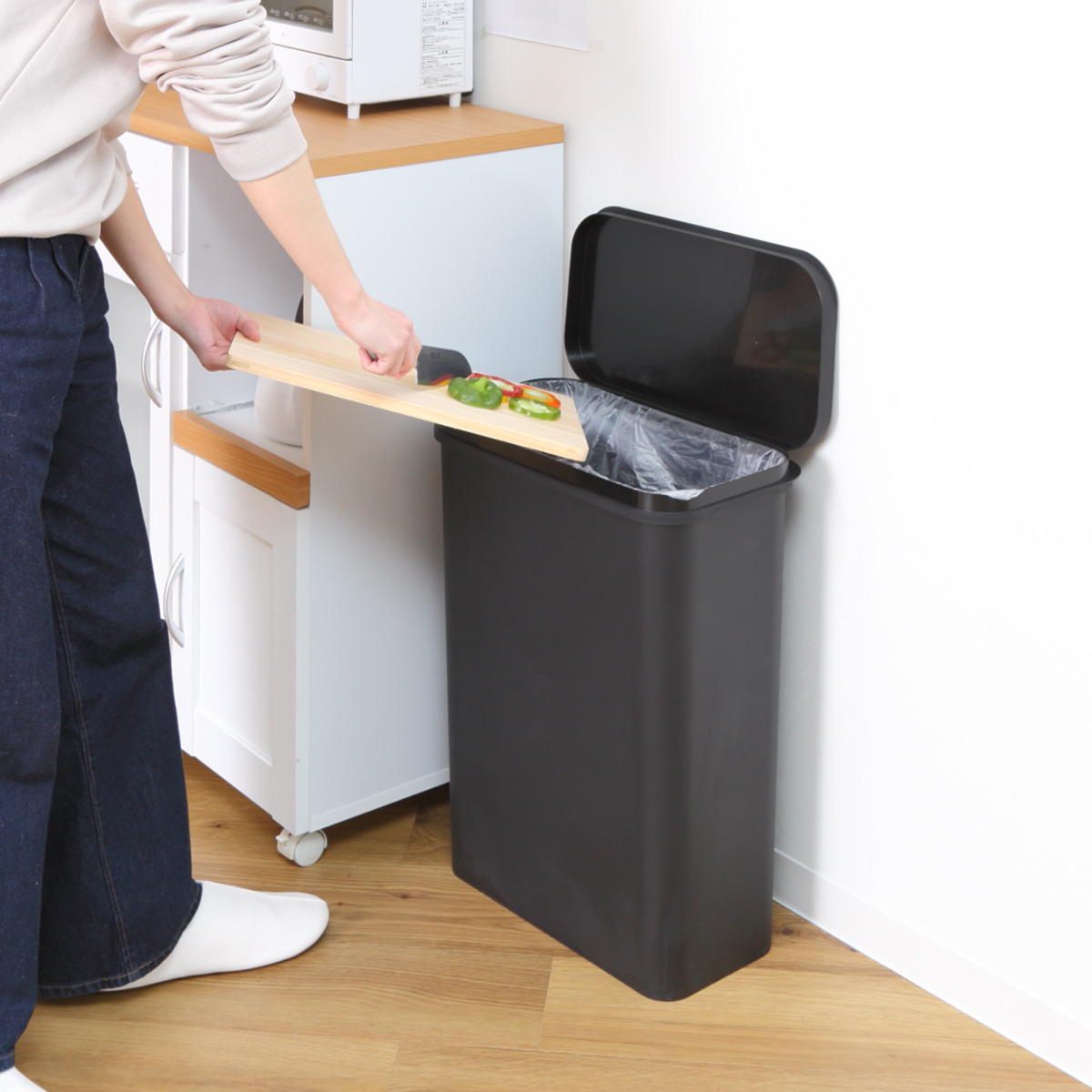 ふたは開けたままにできるので、調理時やお掃除中など連続してゴミを捨てたいときや、ゴミをまとめるときに便利です。壁に沿って通路脇やシンク横に設置しやすい、約25cmと奥行を抑えた横開きタイプです。
