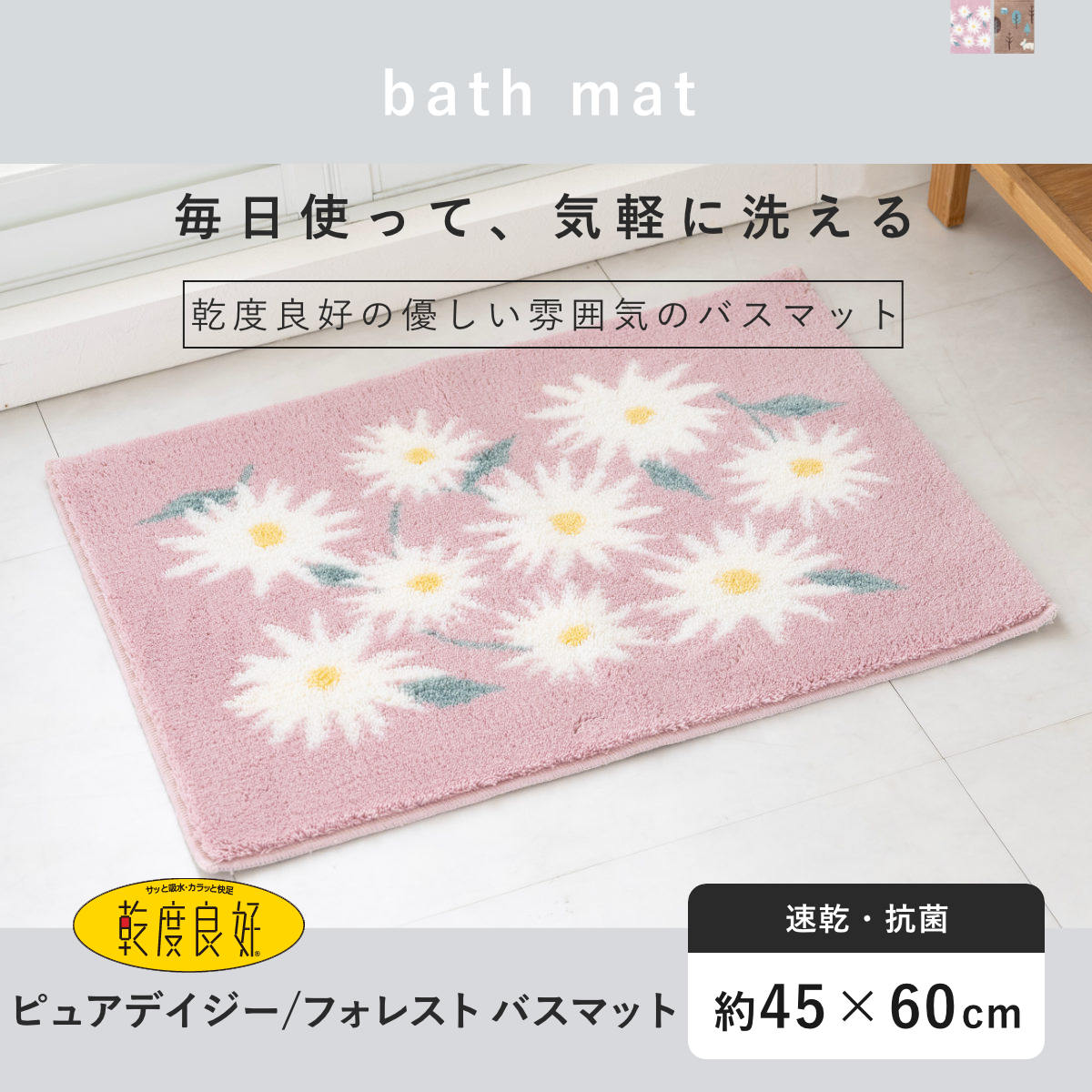 バスマット 乾度良好 45×60cm 速乾 ( お風呂マット マット 吸水 抗菌 防臭 洗濯OK 足ふきマット 45×60 お風呂 バスグッズ 浴室 脱衣所 足拭き ピュアデイジー フォレスト ) 【フォレスト】