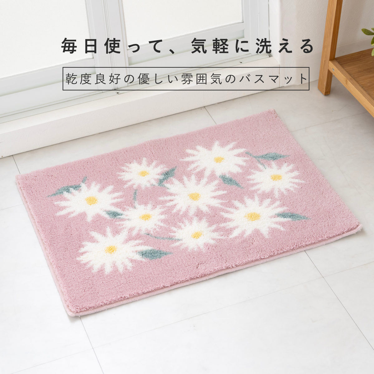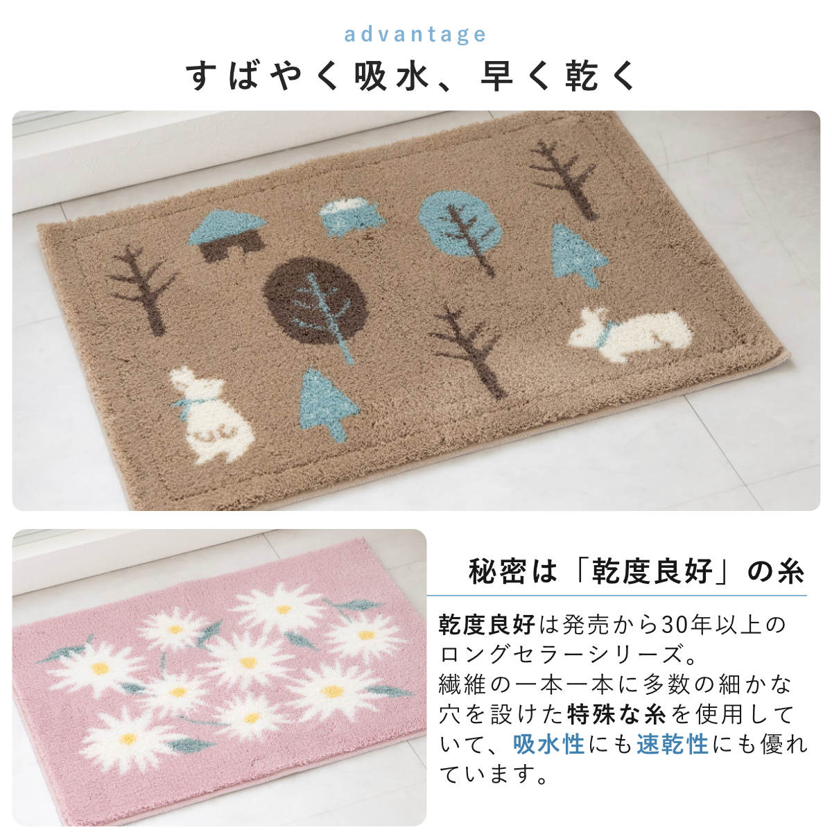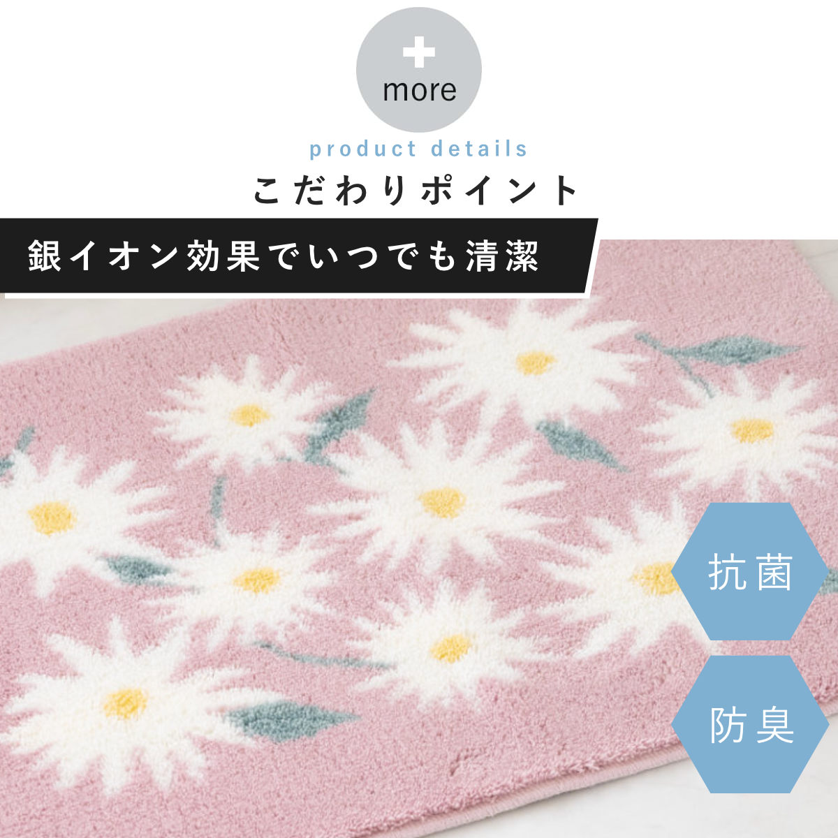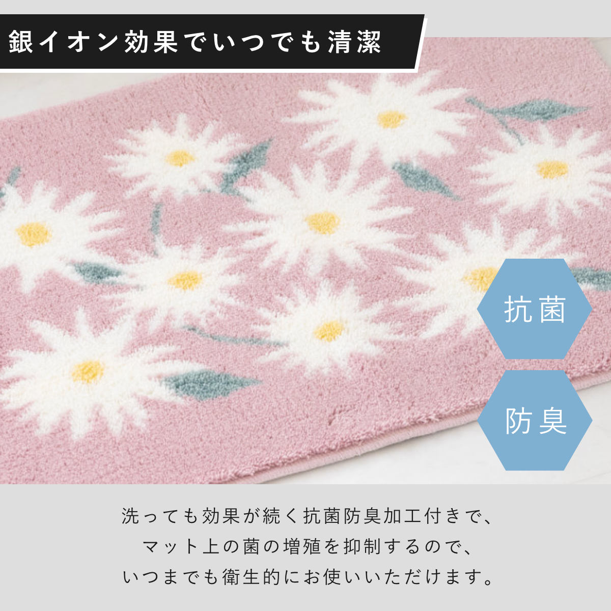洗っても効果が続く抗菌防臭加工付きで、マット上の菌の増殖を抑制するので、いつまでも衛生的にお使いいただけます。