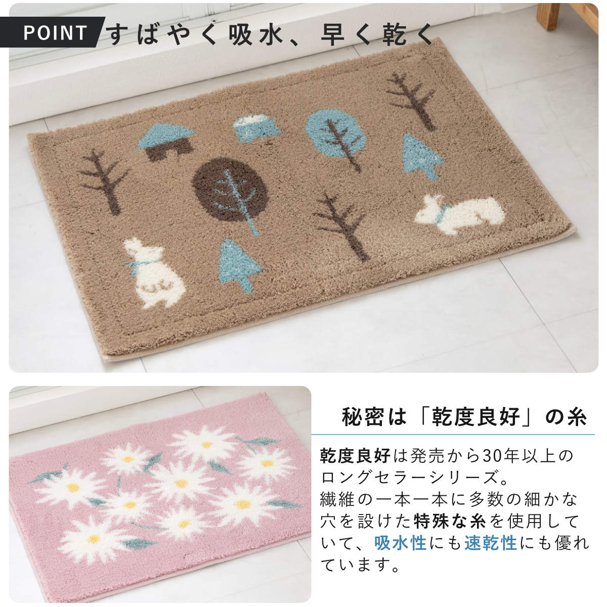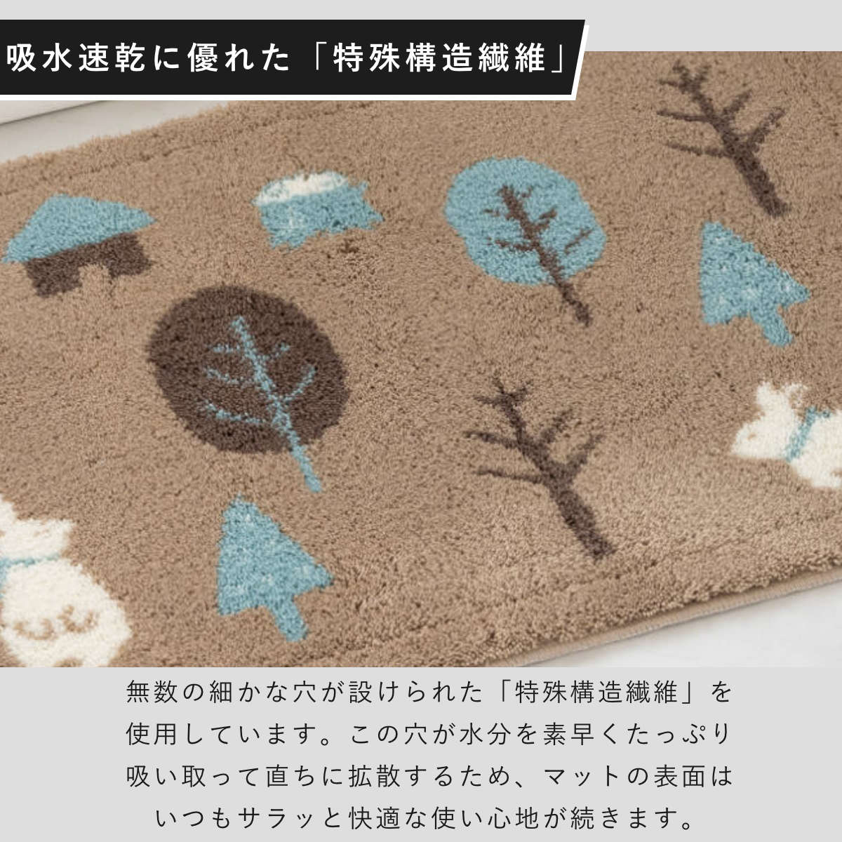 無数の細かな穴が設けられた「特殊構造繊維」を使用しています。この穴が水分を素早くたっぷり吸い取って直ちに拡散するため、マットの表面はいつもサラッと快適な使い心地が続きます。