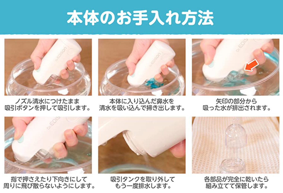 吸引が完了したら、パーツは毎回洗浄して清潔に保ってください。本体からパーツを外し、水洗い・薬液消毒・煮沸消毒で消毒します。(ノズルと各パッキンは電子レンジ消毒と食洗器乾燥機のお手入れが可能です)