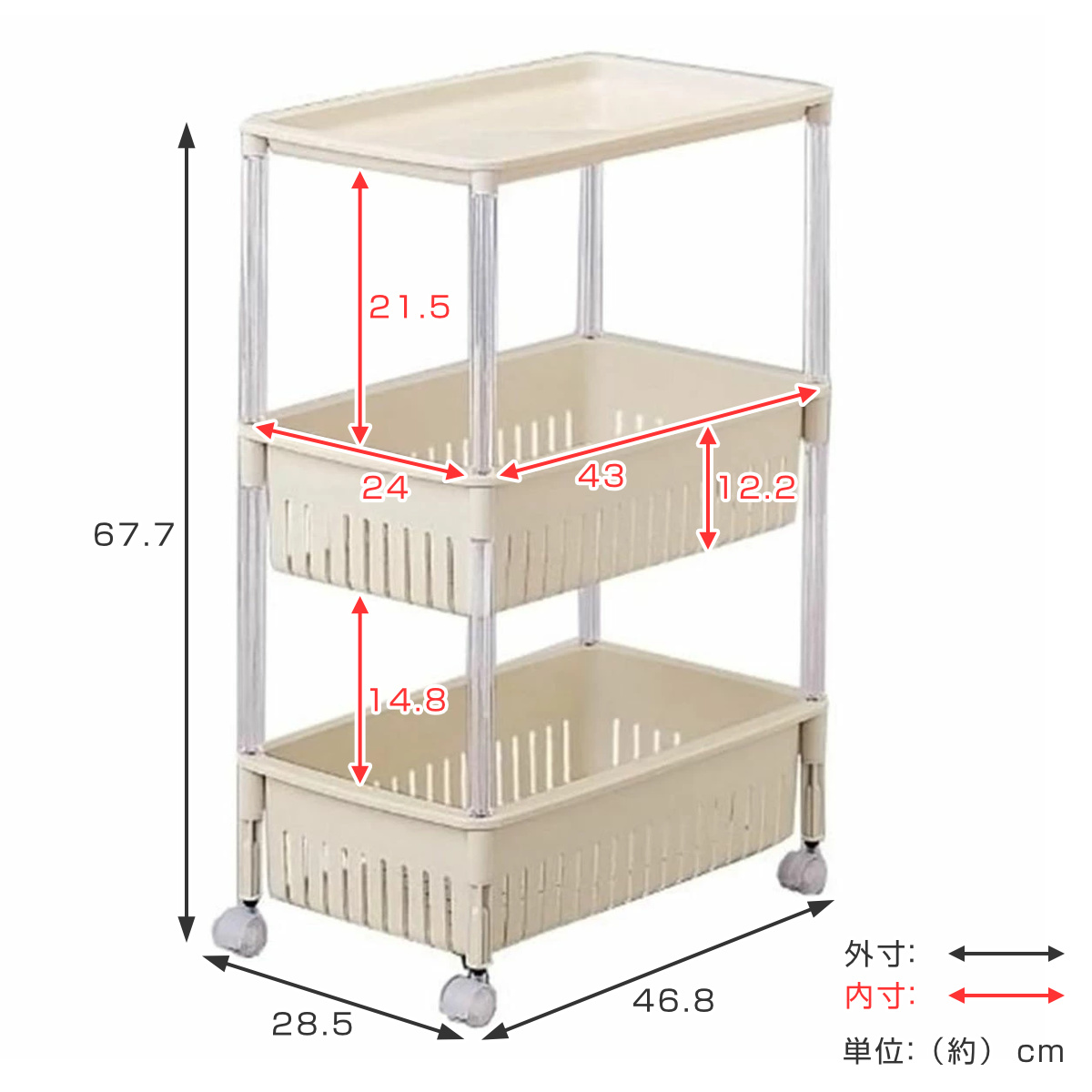 | 材質 | カゴ・キャスター:ポリプロピレン 支柱:ポリスチレン |
