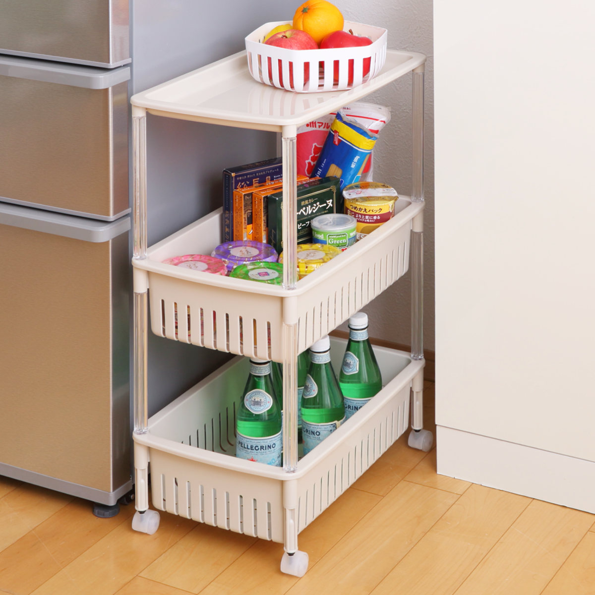 調味料や乾物のストックにちょうど良いオープンタイプのキッチンワゴンです。幅28.5cmとスリム設計なので、冷蔵庫横やちょっとしたすき間を収納として有効活用できます。