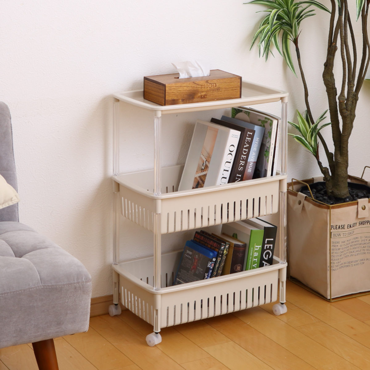 シンプルなデザインなのでどこに置いてもインテリアの邪魔をしません。よく使う物を手に取りやすい場所にまとめてコンパクトに収納できます。