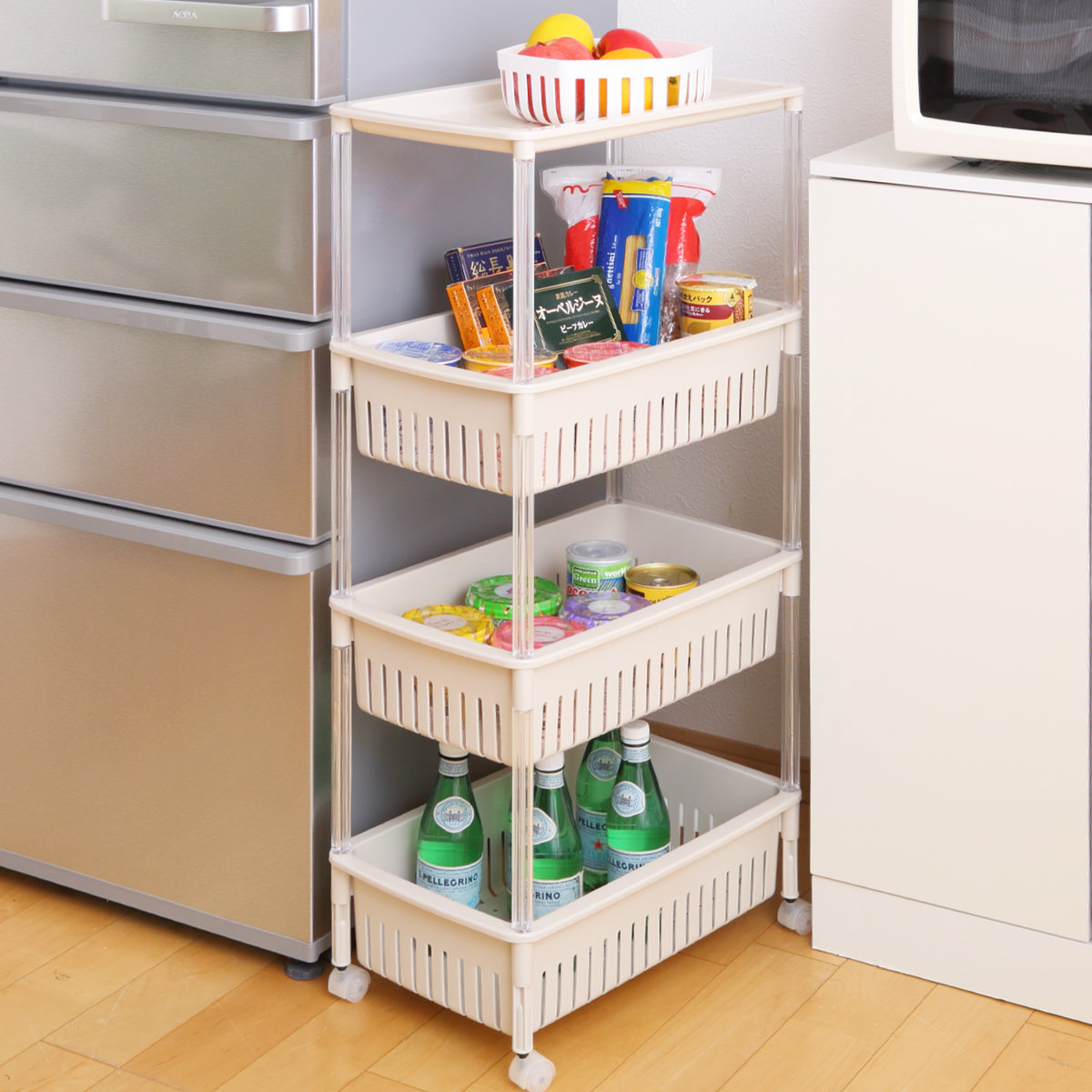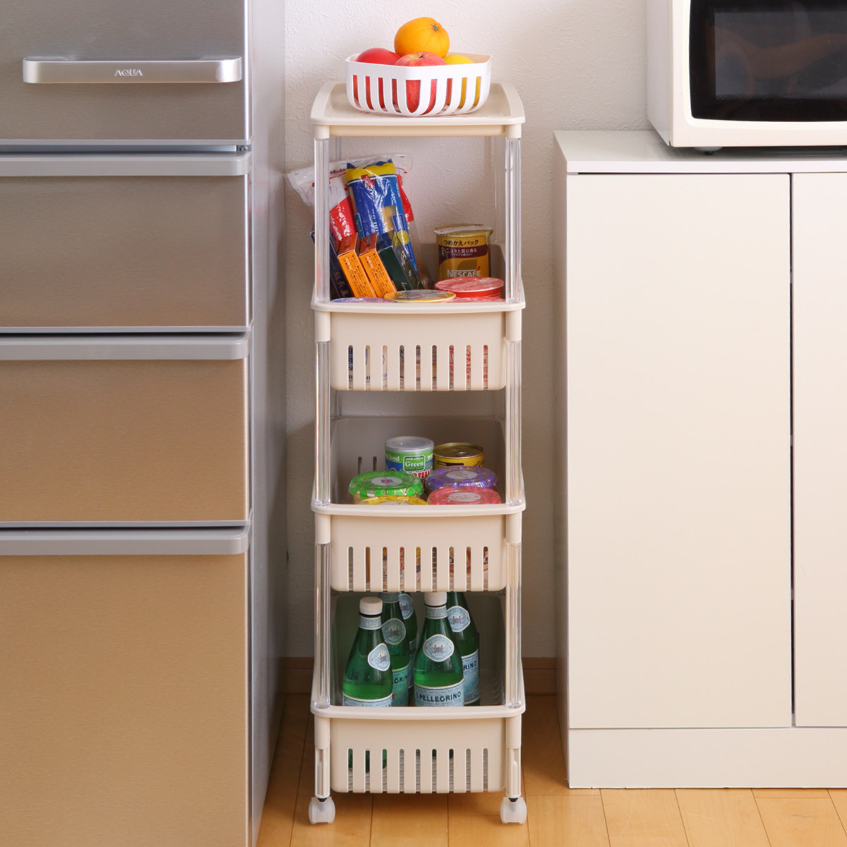 調味料や乾物のストックにちょうど良いオープンタイプのキッチンワゴンです。幅28.5cmとスリム設計なので、冷蔵庫横やちょっとしたすき間を収納として有効活用できます。