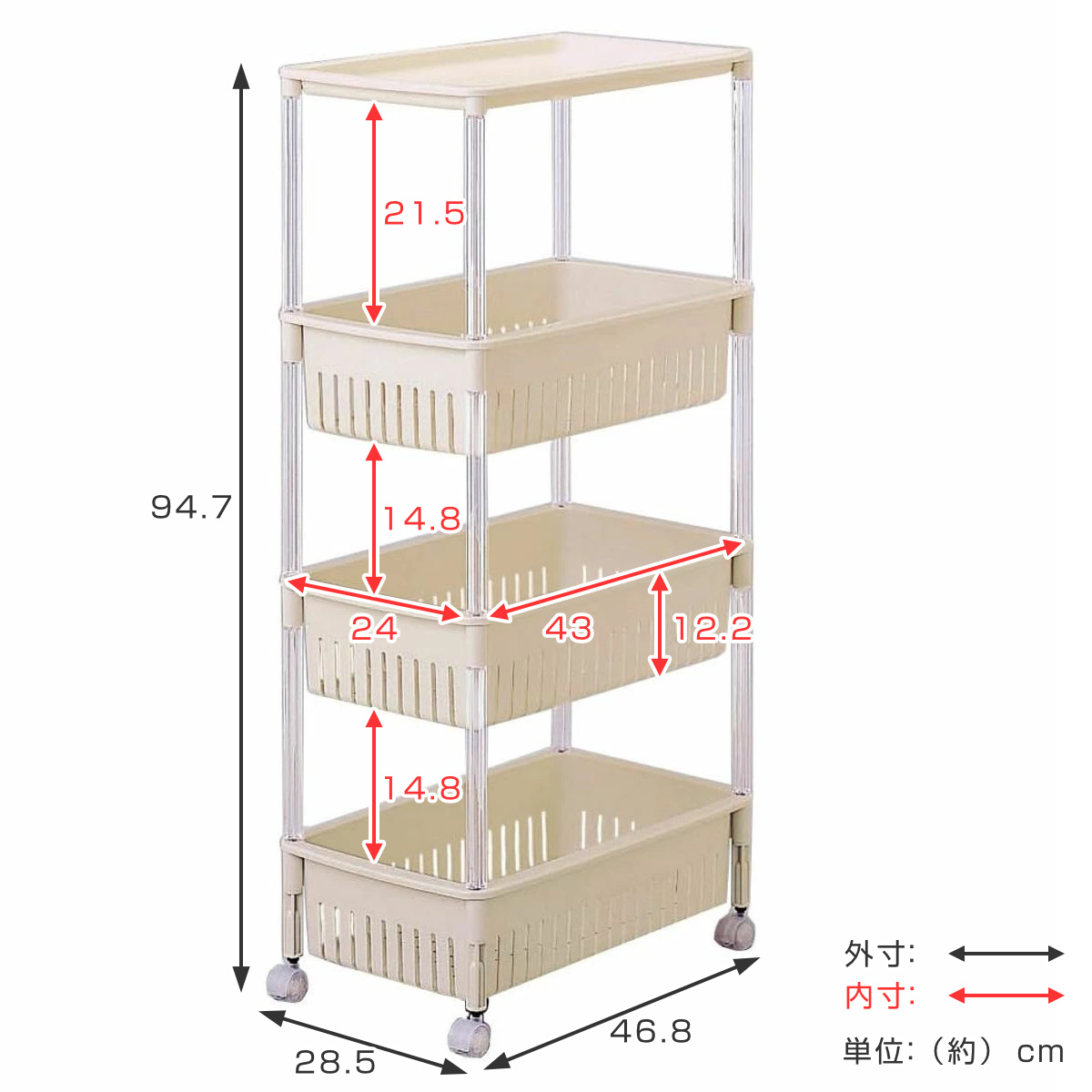 | 材質 | カゴ・キャスター:ポリプロピレン 支柱:ポリスチレン |