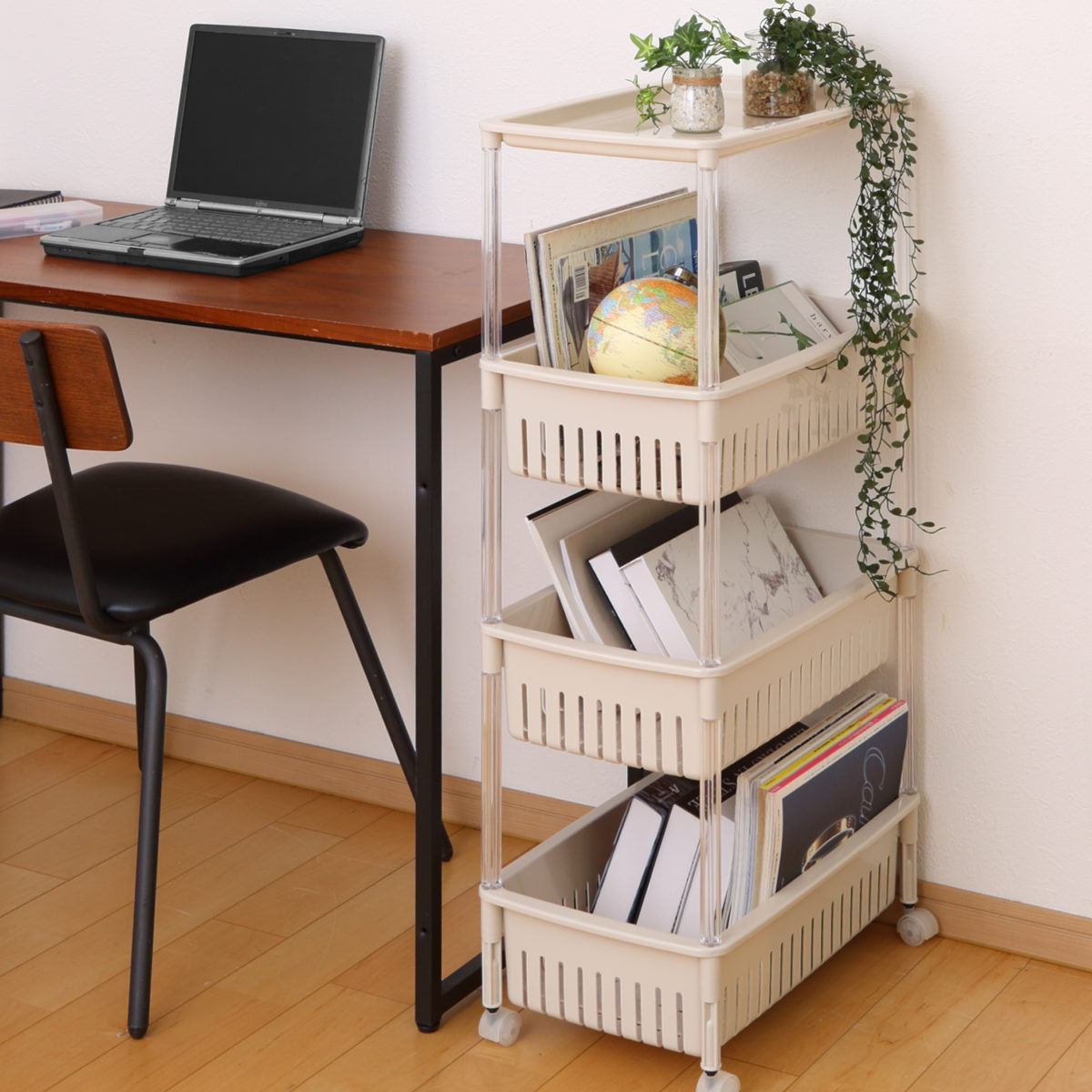 シンプルなデザインなのでどこに置いてもインテリアの邪魔をしません。よく使う物を手に取りやすい場所にまとめてコンパクトに収納できます。