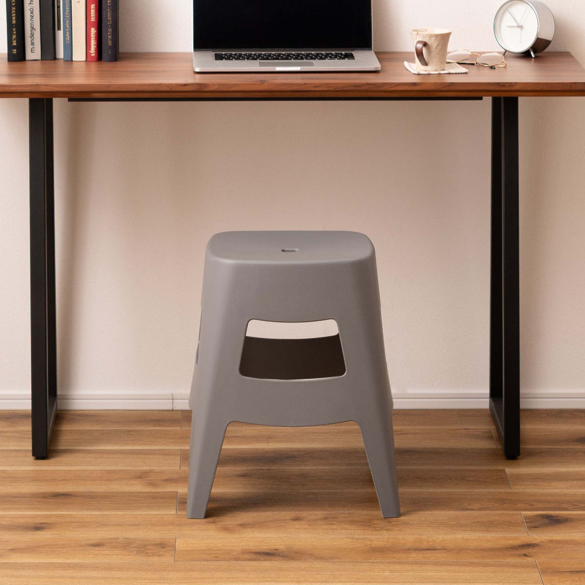 お部屋の雰囲気に馴染みやすいシンプルなデザインのスツールです。リビングやキッチンの簡易チェアとして使いたい場所に置くことができます。高さは約45cmあるのでデスクとの相性はピッタリです。