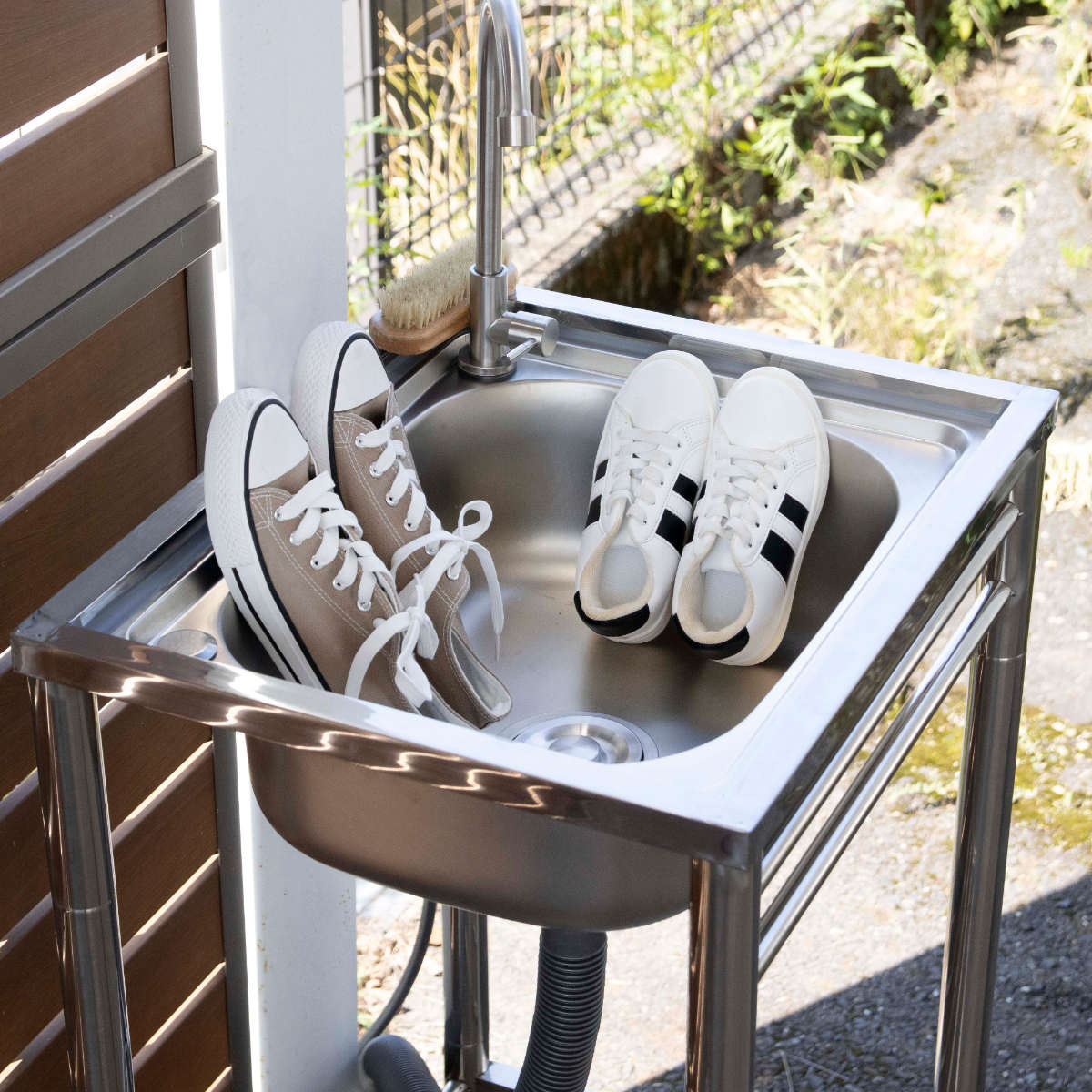 キッチンや洗面台では洗いにくい土汚れが気になる物や、バーベキュー後の片付けなどにも便利。様々なシーンで大活躍する万能アイテムです。シンクに深さがあるのでつけ置きもでき、洗い終えた靴も立て掛けておけます。
