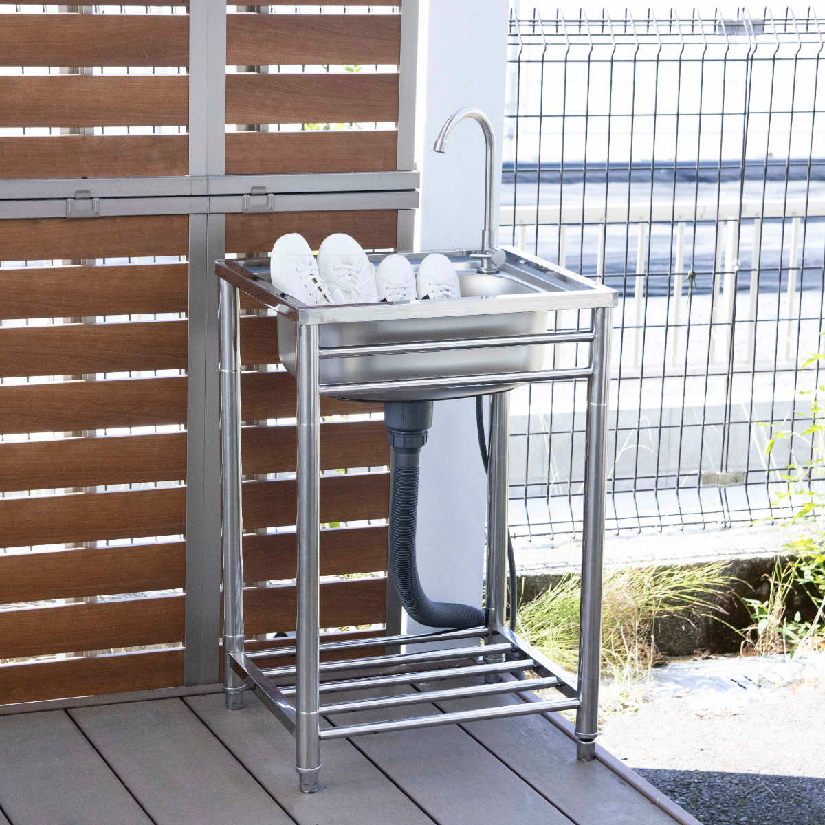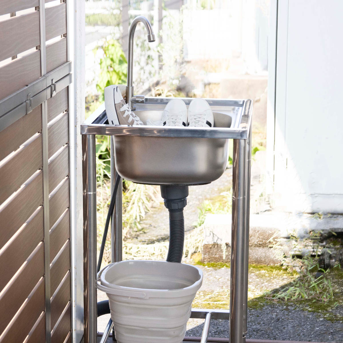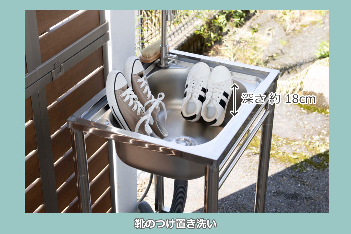 キッチンや洗面台では洗いにくい土汚れが気になる物や、バーベキュー後の片付けなどにも便利。様々なシーンで大活躍する万能アイテムです。シンクに深さがあるのでつけ置きもでき、洗い終えた靴も立て掛けておけます。