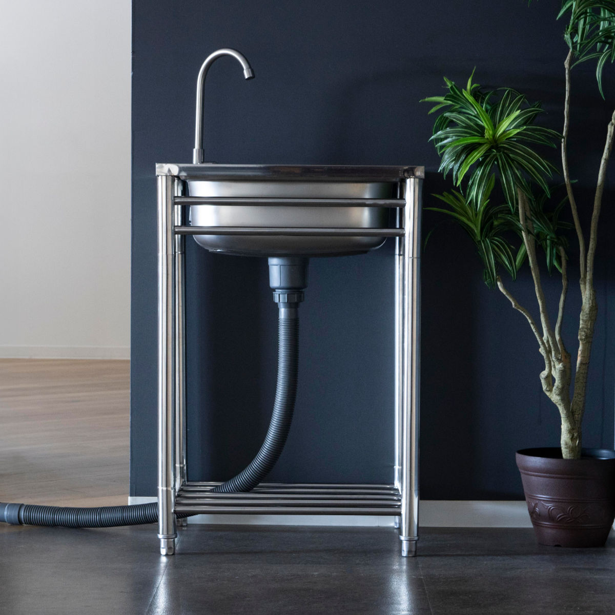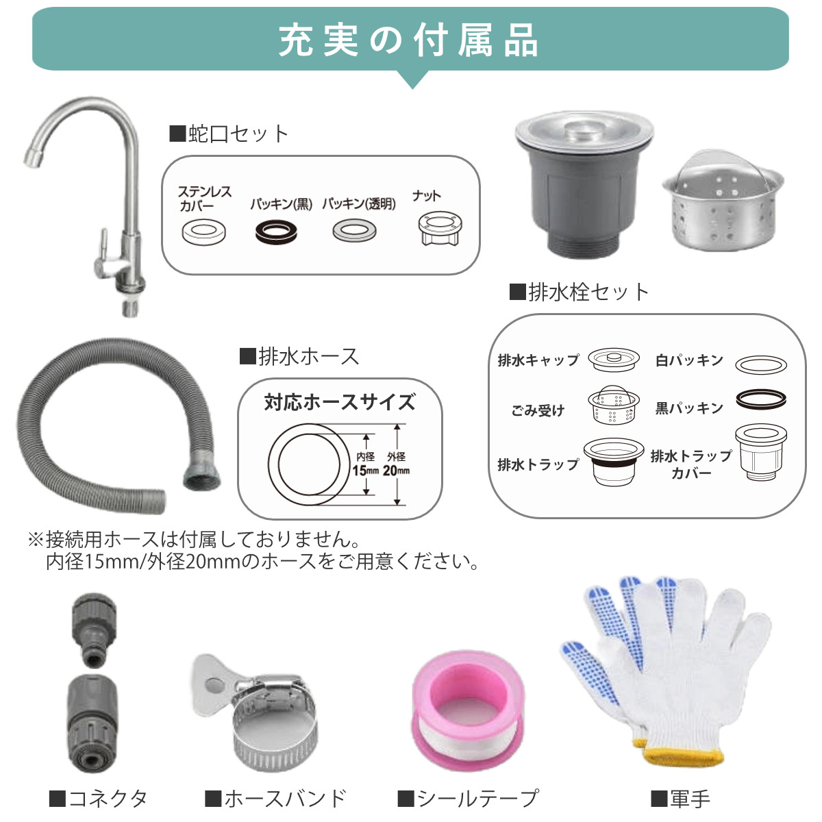 | 材質 | シンク・棚板・支柱:ステンレス 排水ホースキャップ:ポリプロピレン 排水ホース:ポリエチレン パッキン:塩化ビニル樹脂 排水栓:ステンレス、ポリプロピレン、塩化ビニル樹脂、EVA樹脂 蛇口:ステンレス、塩化ビニル樹脂、ABS樹脂 コネクタ:ポリプロピレン、ABS樹脂 ニップル:ABS樹脂、TPR ホースバンド:ステンレス、スチール アジャスター:ステンレス、ポリプロピレン シールテープ: ポリテトラフルオロエチレン |