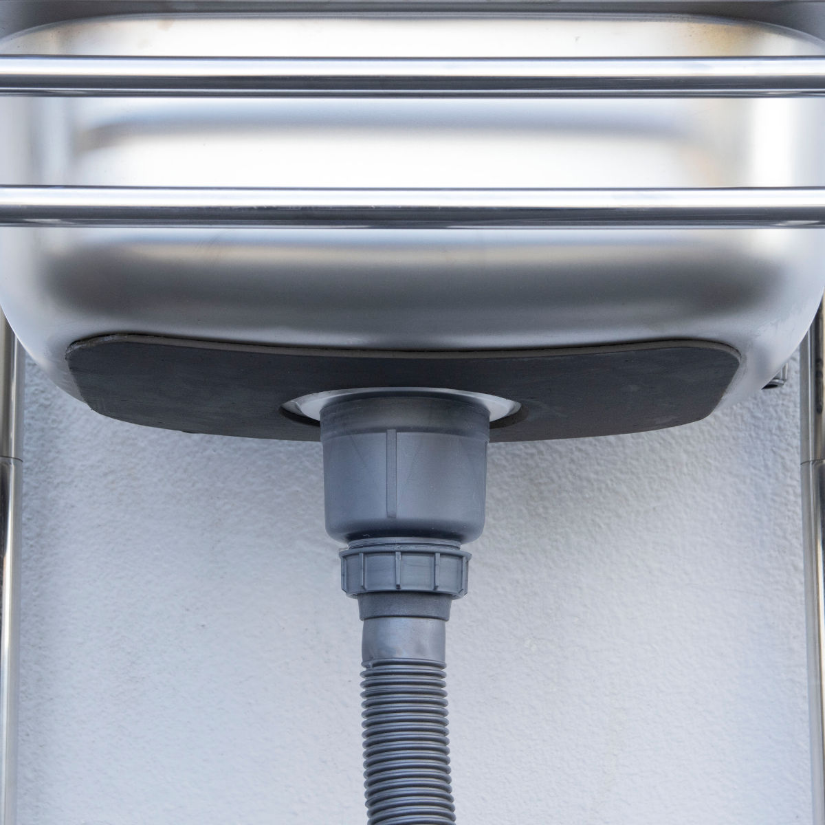 流し台の底面に防音パットが付いているので、流水音を気にせずお使いいただけます。さらに、排水ホースは泥が溜まりにくいストレート排水管になっています。