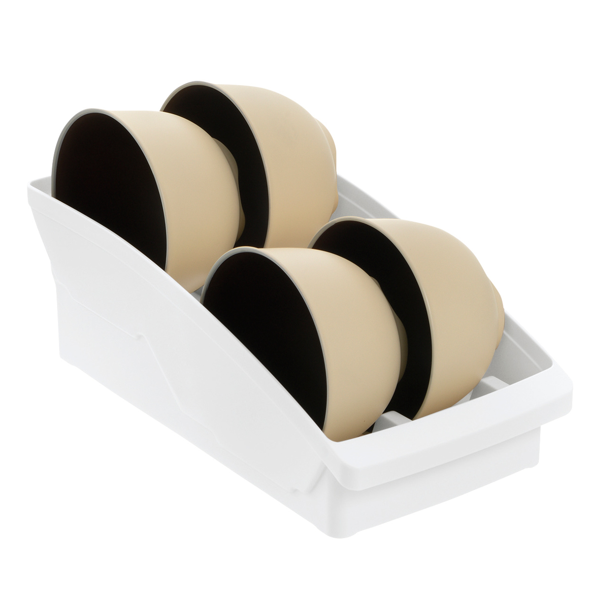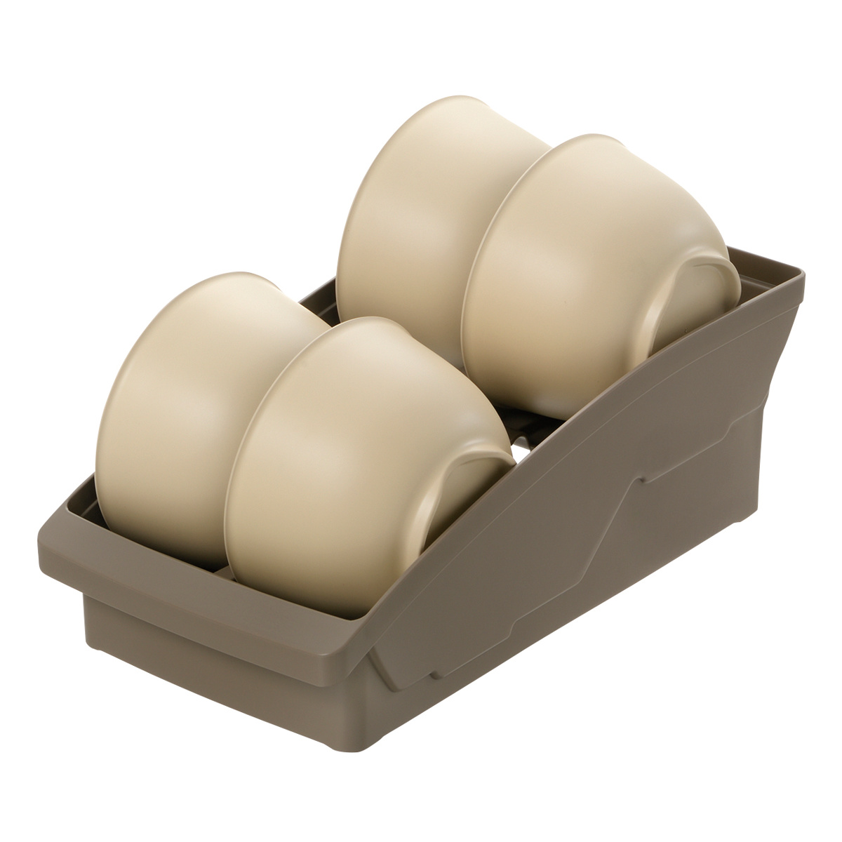 直径7~13cmまでのお椀や茶碗、ボウルを4個まで収納できる棚置き用お椀スタンドです。食器を支える部分には段差が付いているので、浅・深どちらの形状の食器も立てかけられます。