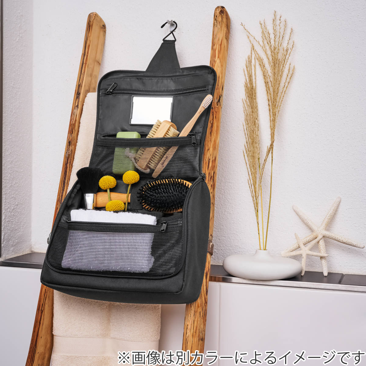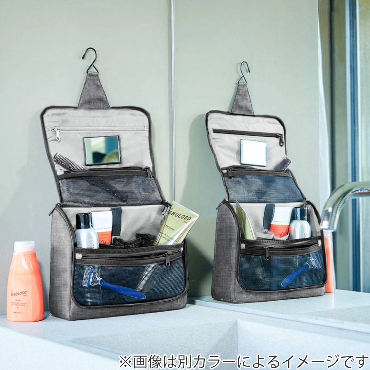 ポーチにはフックが付いているので、バスルームや洗面所に吊り下げてお使いいただけます。ポーチを広げるとドレッサーのように使えるので、身だしなみを整える際に便利です。