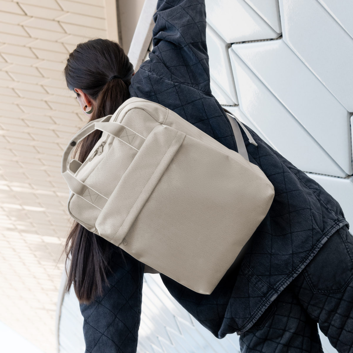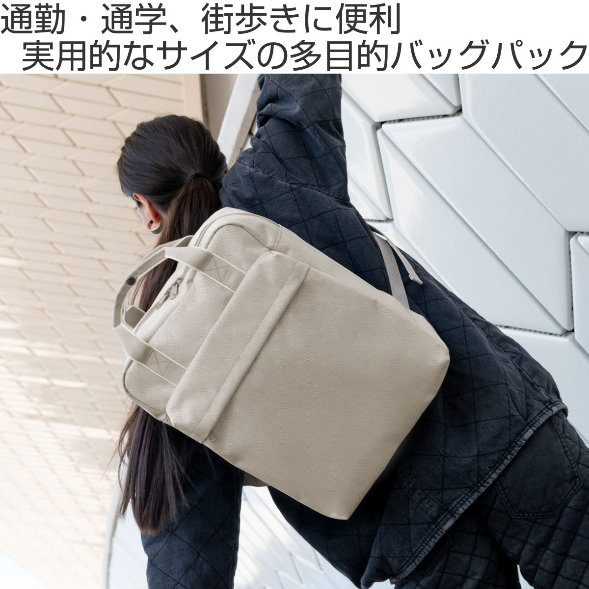 休日のお出かけはもちろん、通勤や通学まで幅広い用途で使える多目的バッグパックです。すっきりとしたシルエットながらも、たくさん収納できる実用的なサイズです。どんなスタイルにも合わせやすいシンプルで上品なデザインです。
