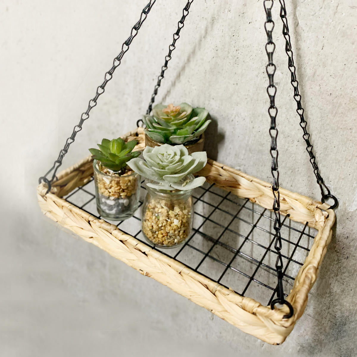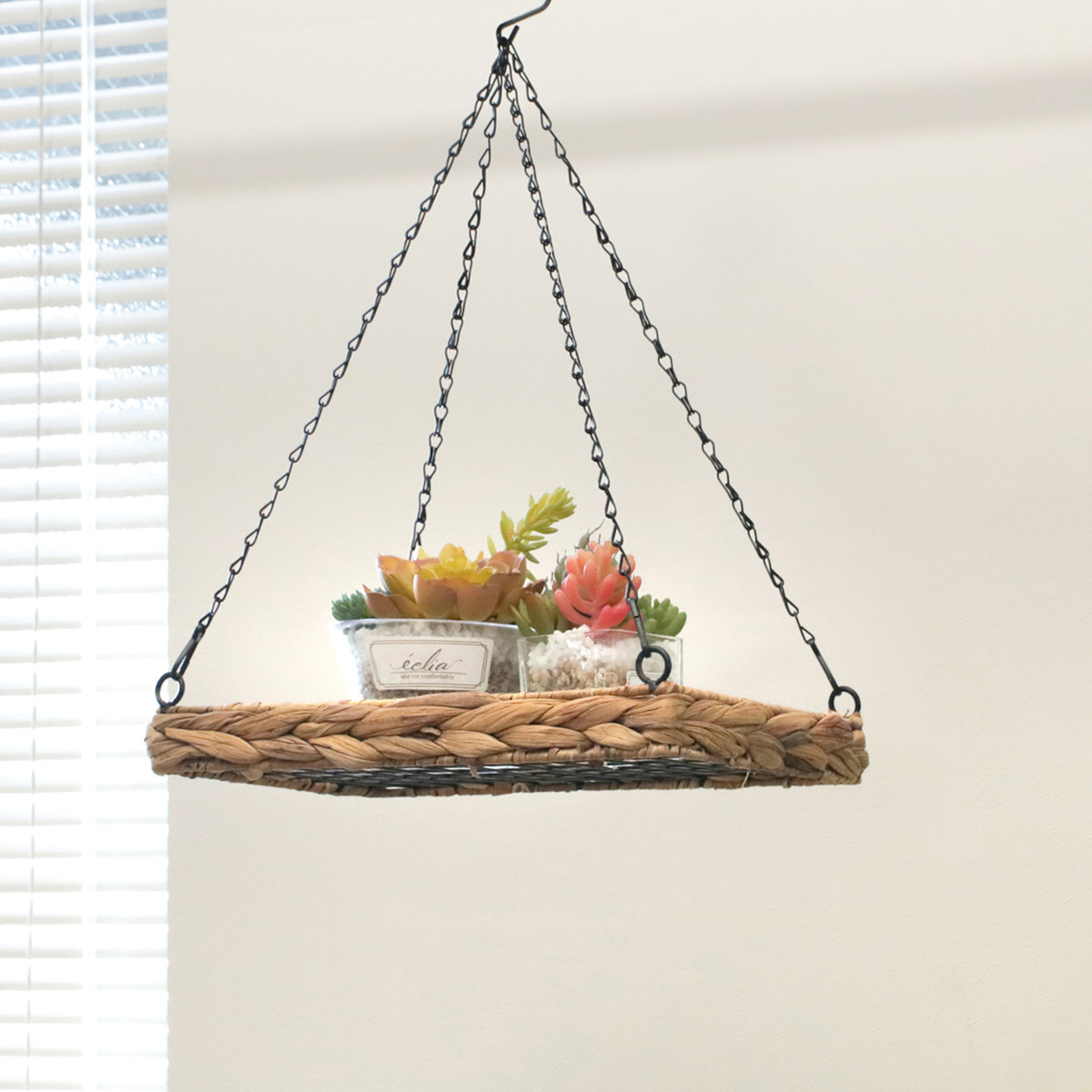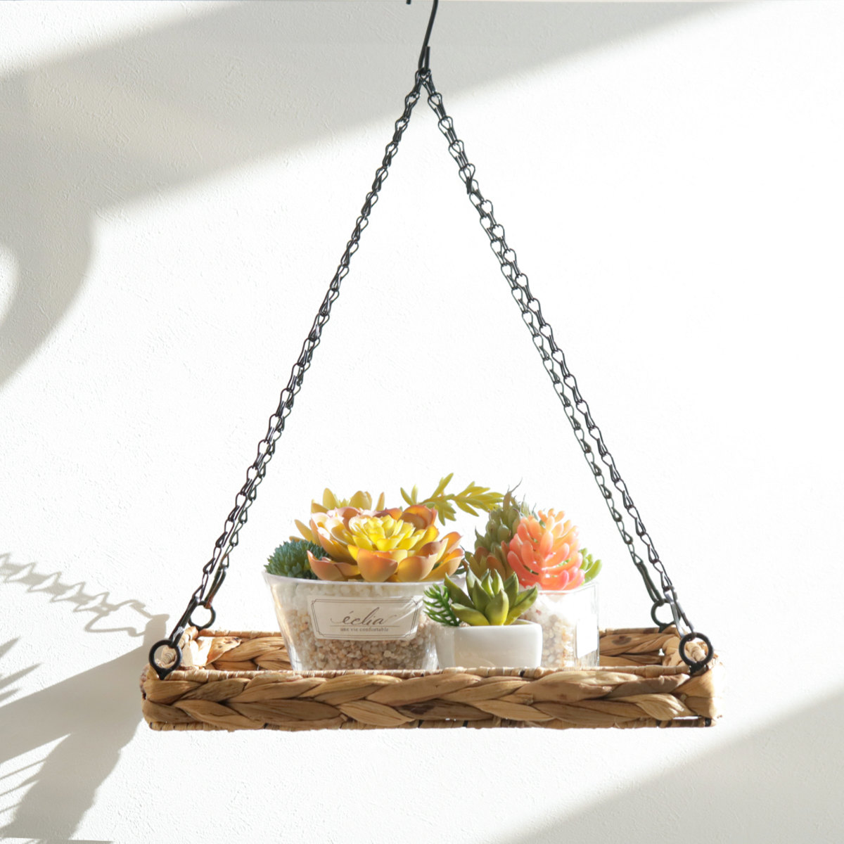 天然素材を使用した手編み感のあるハンギングシェルフです。天井から吊るす手軽なインテリアとしてお楽しみいただけます。フェイクグリーン、イミテーションフラワーなど入れてアレンジしたり、エアプランツなどの植物を置いて飾るのもおすすめです。