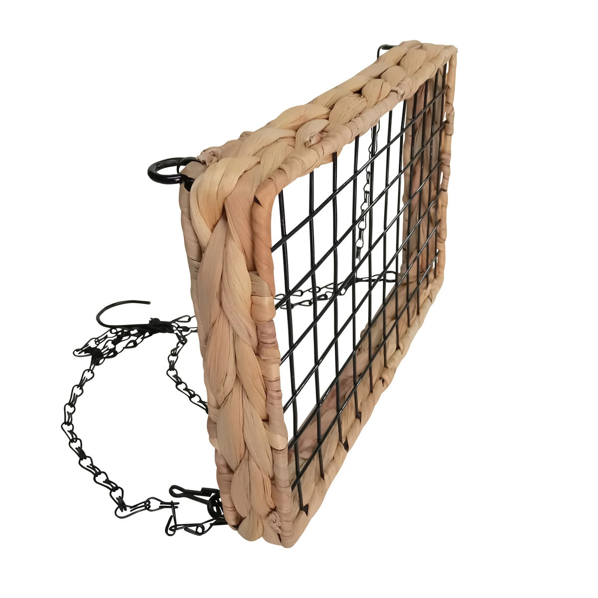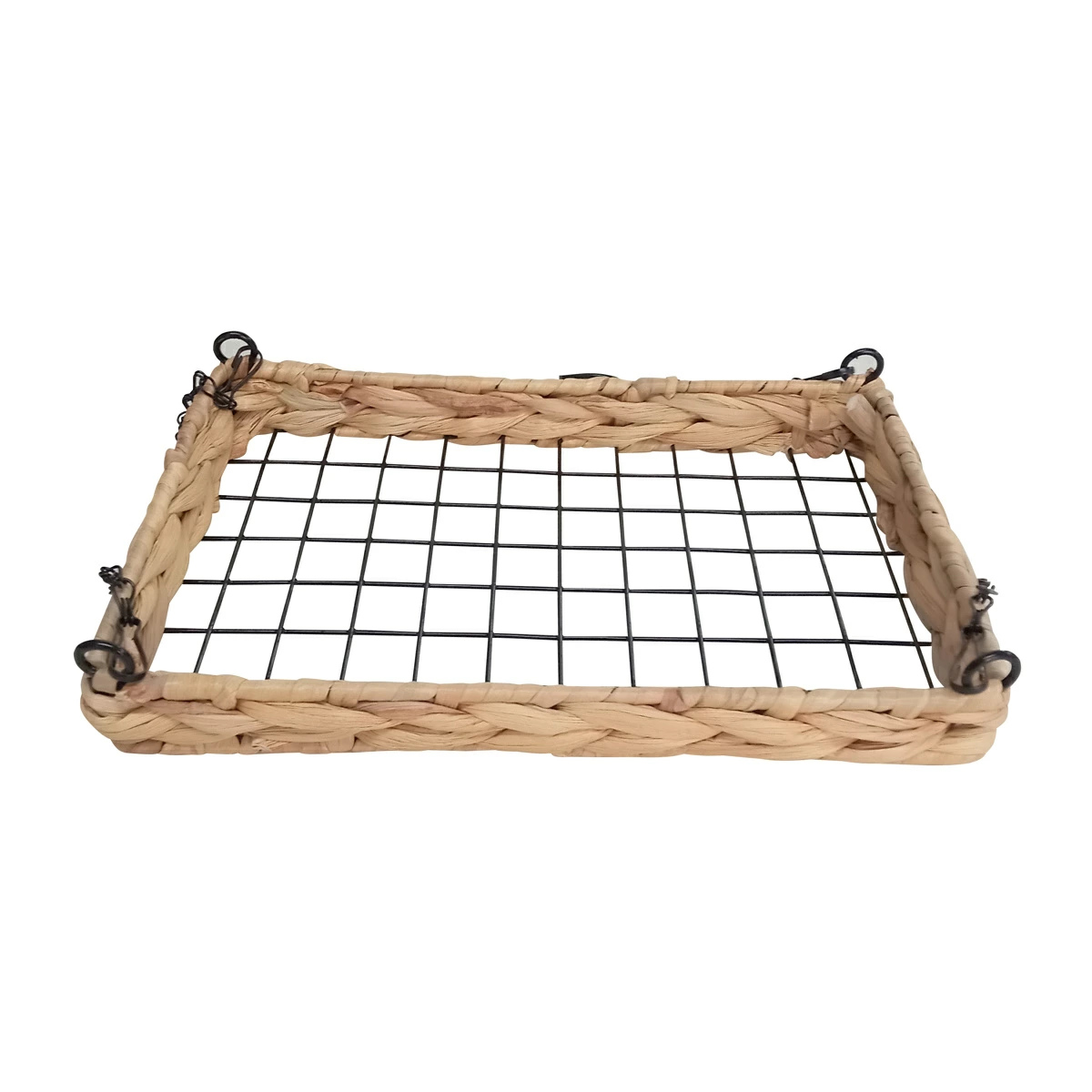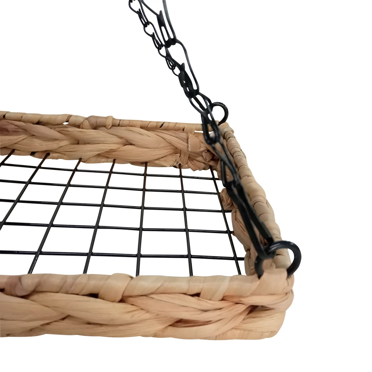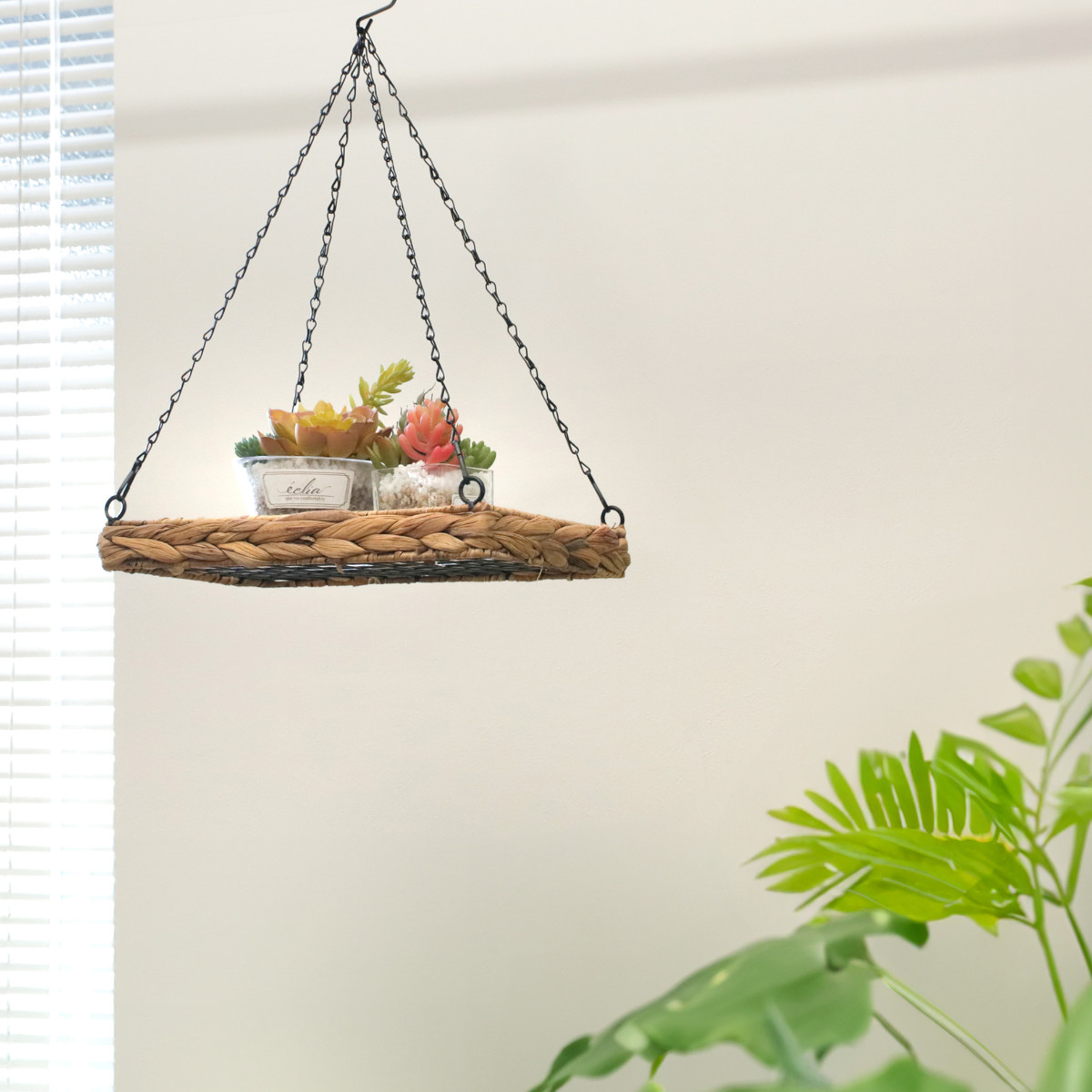 天然素材を使用した手編み感のあるハンギングシェルフです。天井から吊るす手軽なインテリアとしてお楽しみいただけます。フェイクグリーン、イミテーションフラワーなど入れてアレンジしたり、エアプランツなどの植物を置いて飾るのもおすすめです。