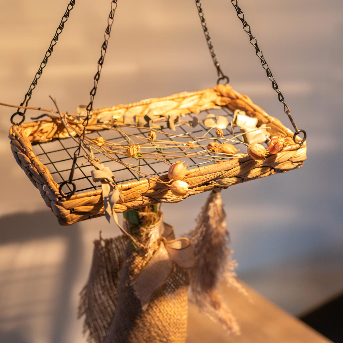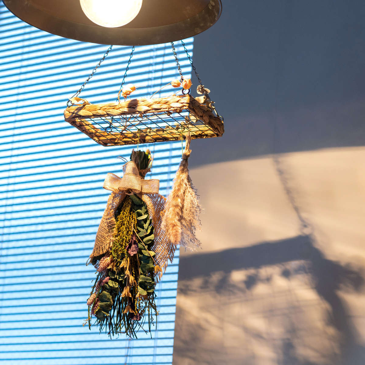 網目部分にS字フックを使ってインテリアになるものを吊るしたり、ドライフラワーやスワッグなどを吊るせば、お部屋の雰囲気を優しく彩ってくれます。