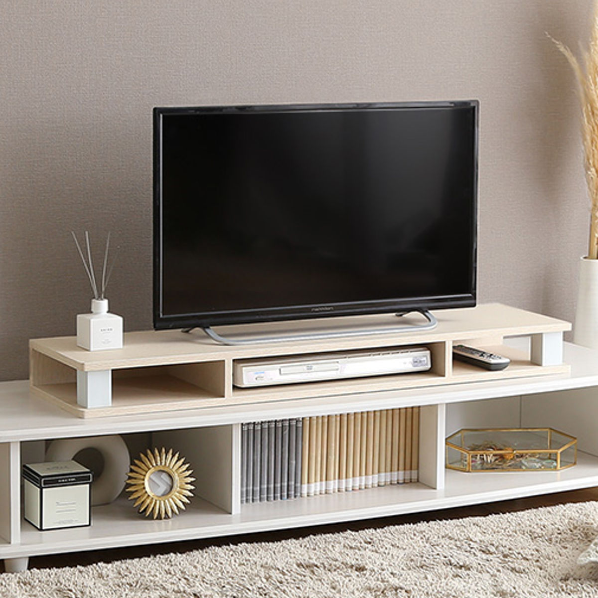 テレビ台の上で使うだけでなく、様々な使い方ができます。テレビを床置きするとホコリがつきやすくなったり、掃除機などで傷つけてしまう恐れがあります。モニター台を置くことで安心してお使いいただけて、お部屋もお洒落に演出できます。また、床にテレビ台を置くスペースがなくても本製品をキャビネットなどの家具の上に置けば即席のテレビ台になります。リモコンやAV機器の設置場所に困ることもありません。