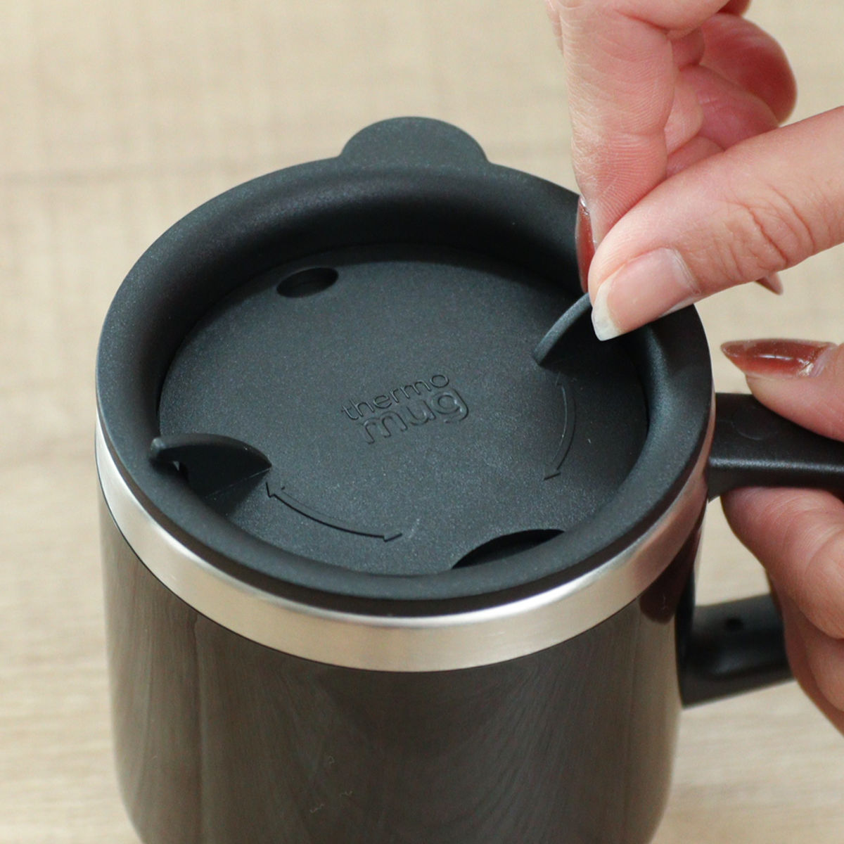 保温性をさらに高めてくれる回転式フタ付きです。飲みたいときに指でスライドさせるだけで簡単に飲めます。ホコリが入るのを防いで、万が一の時にこぼれにくい設計にもなっています。アウトドアやオフィスシーンでも役立ちます。