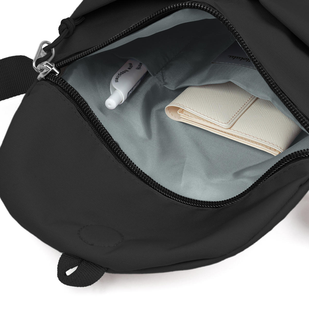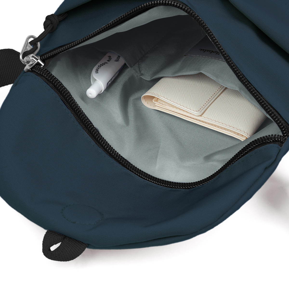 かぶせ部分のファスナーを開ければ、スリップポケットとペンスロットが付いています。中身が整理しやすく、小物類もすっきり収納できます。