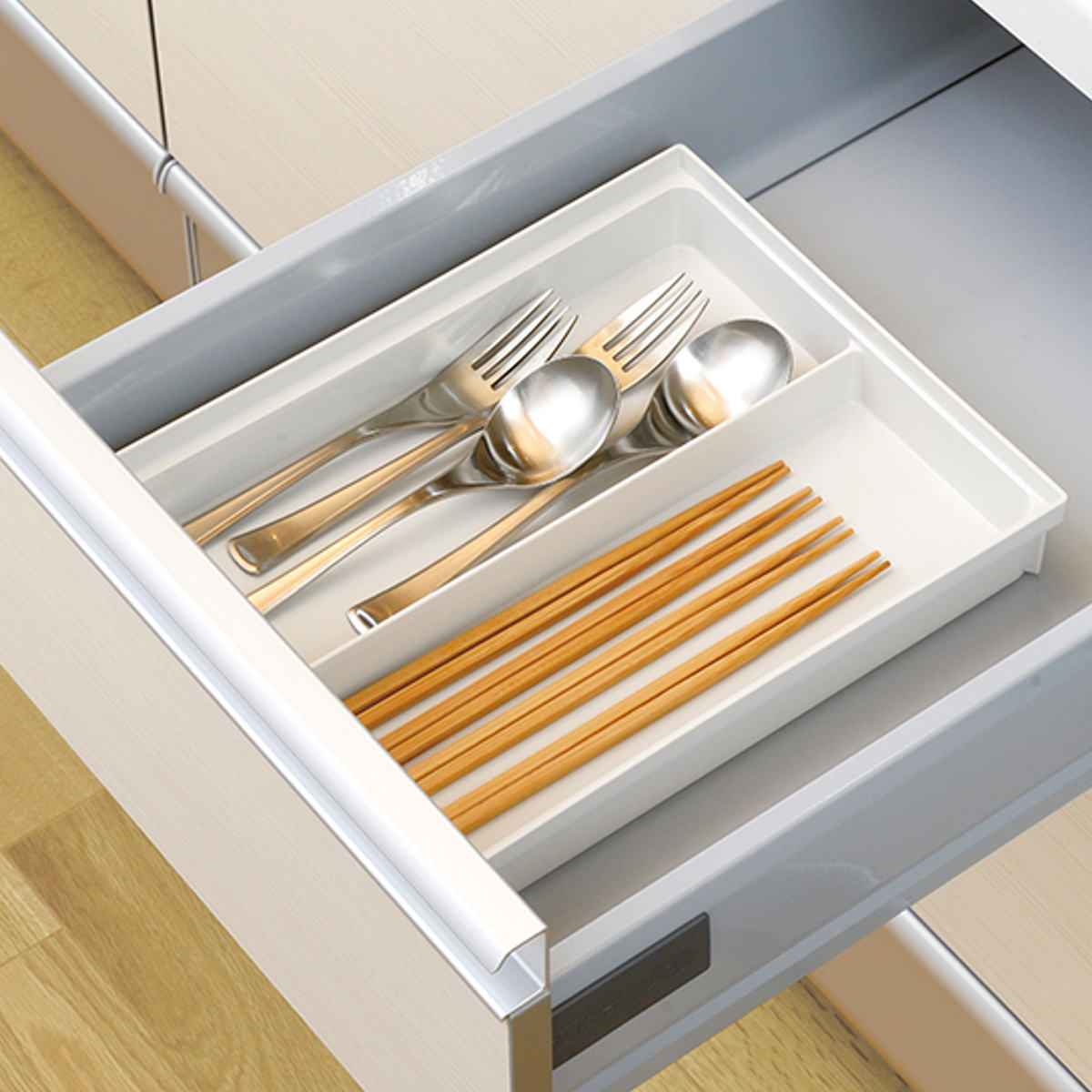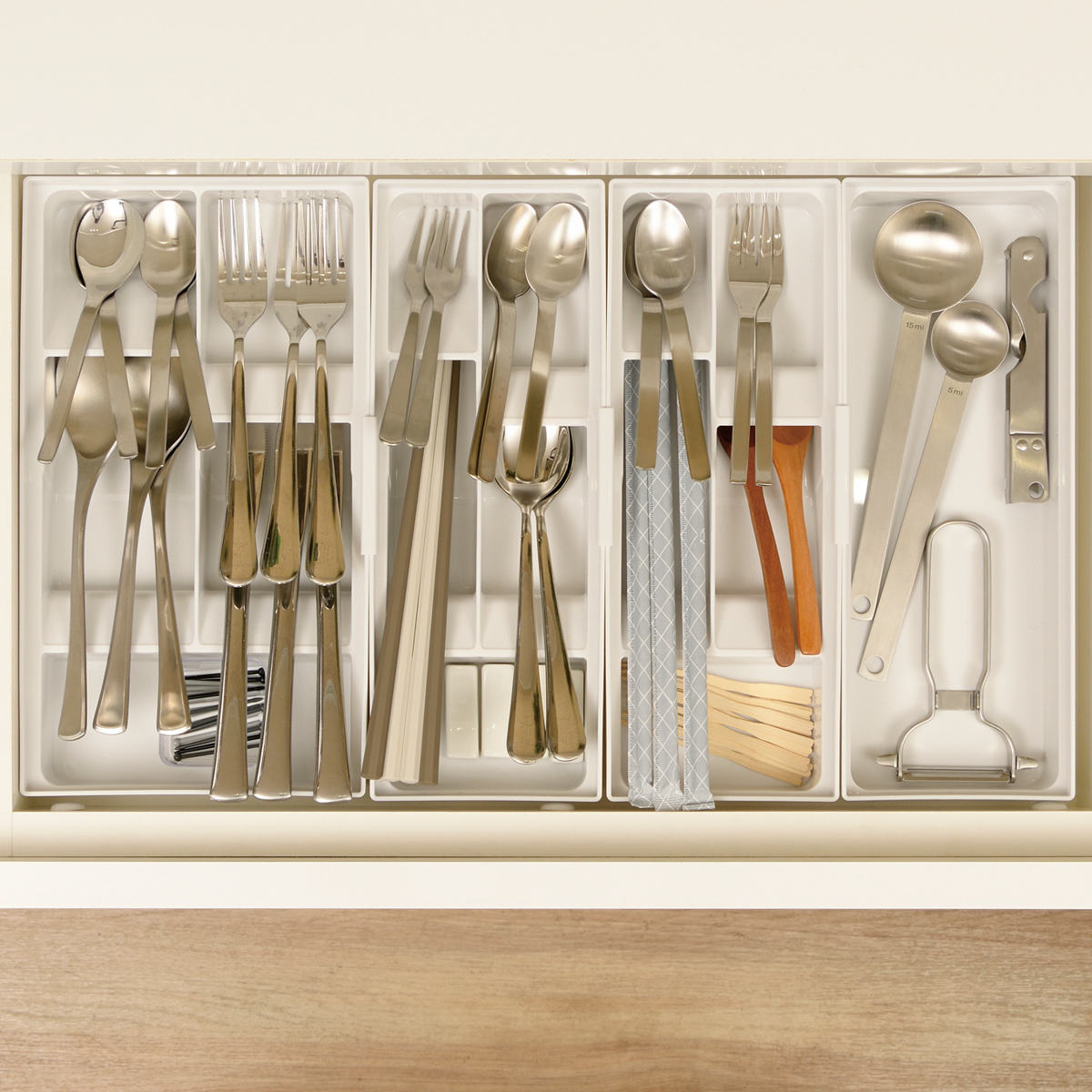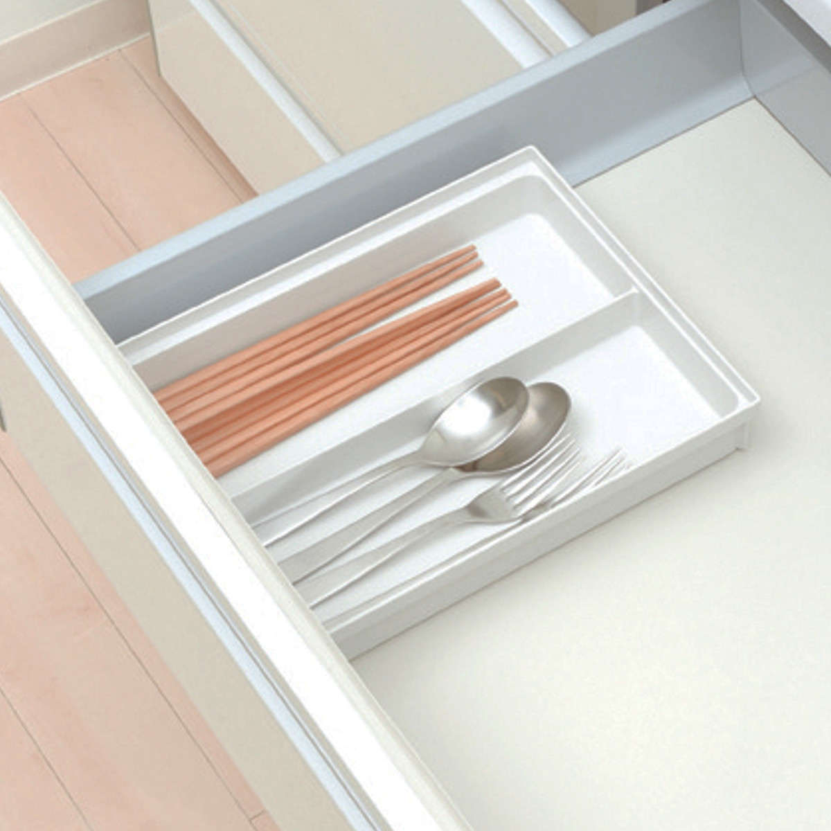 引き出しの中でサイズ別に分けて、様々なカトラリーの定位置を作り美しく収納できます。どこに何があるか引き出しを開けたときに分かりやすく、出したカトラリーをどこに戻すかも一目瞭然です。