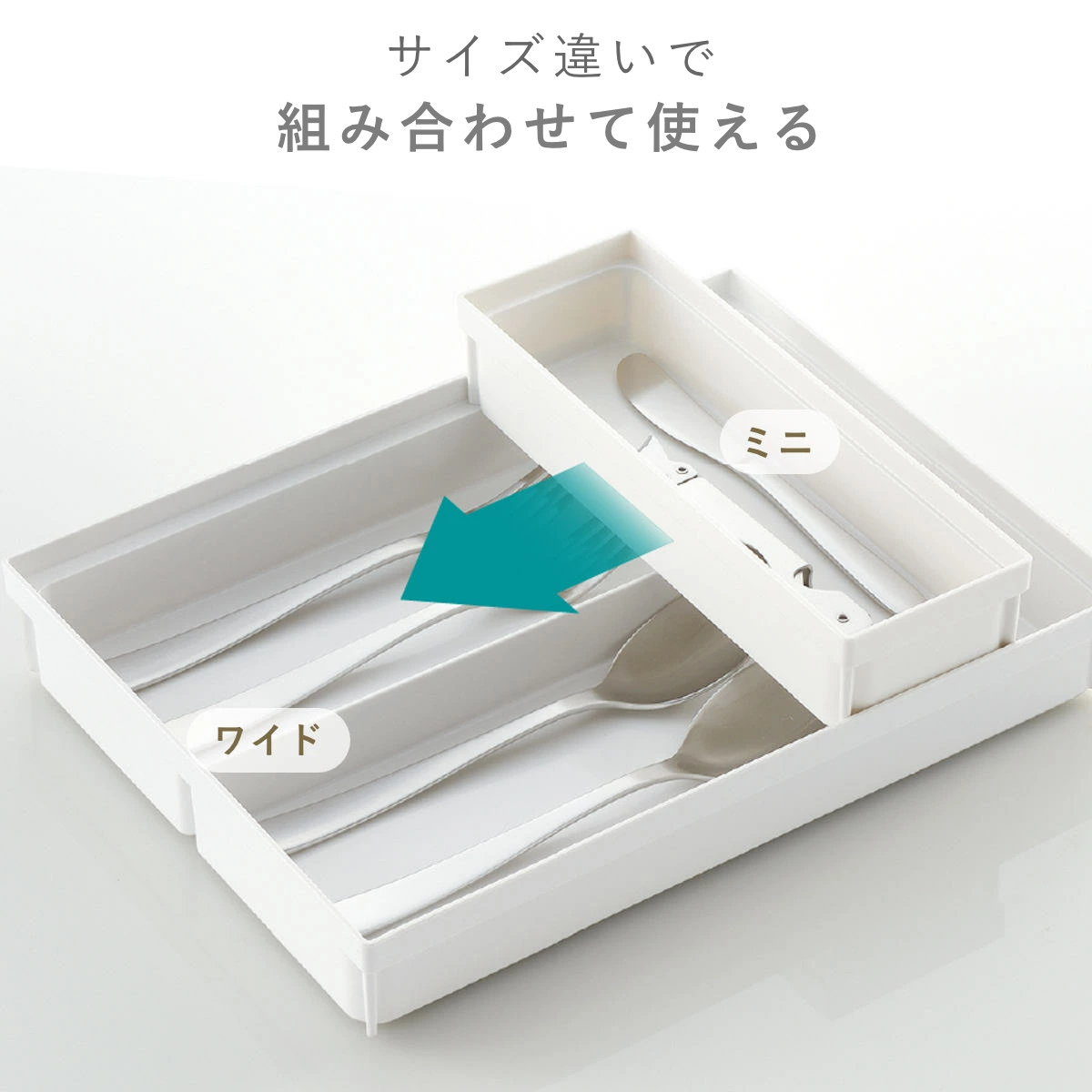 他のサイズと組み合わせることで、引き出しのサイズや目的に合わせて自分好みにカスタマイズできます。カトラリーだけでなく、キッチンツールや調味料、食器など用途別に様々なサイズ、形状をご用意しています。