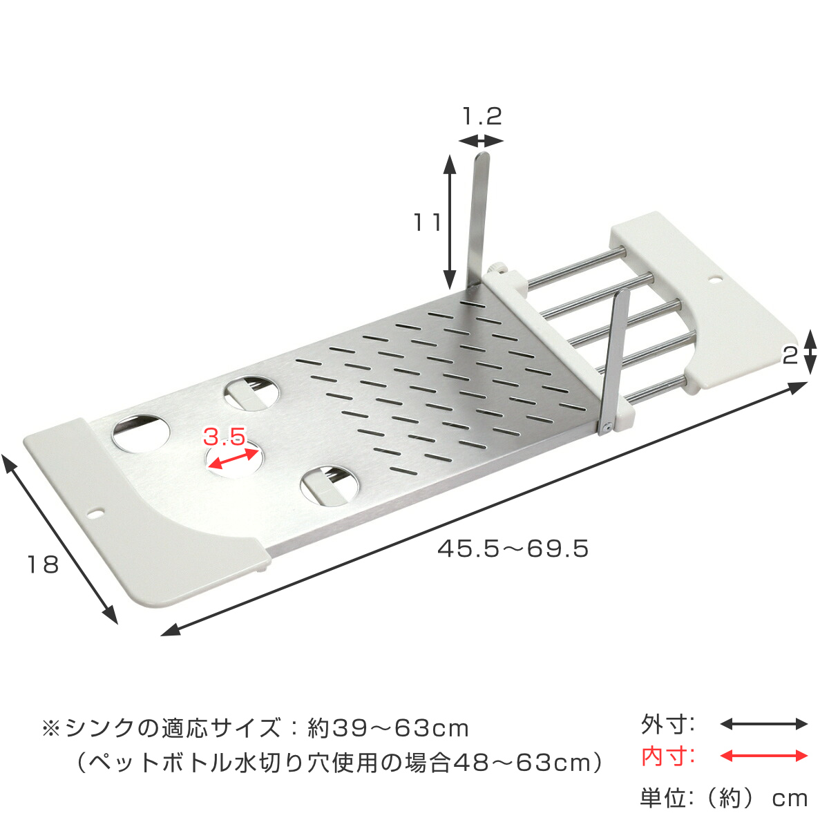 | 対応サイズ | シンク適応サイズ:約 39~63cm (※ペットボトル水切り穴使用の場合48~63cm) |