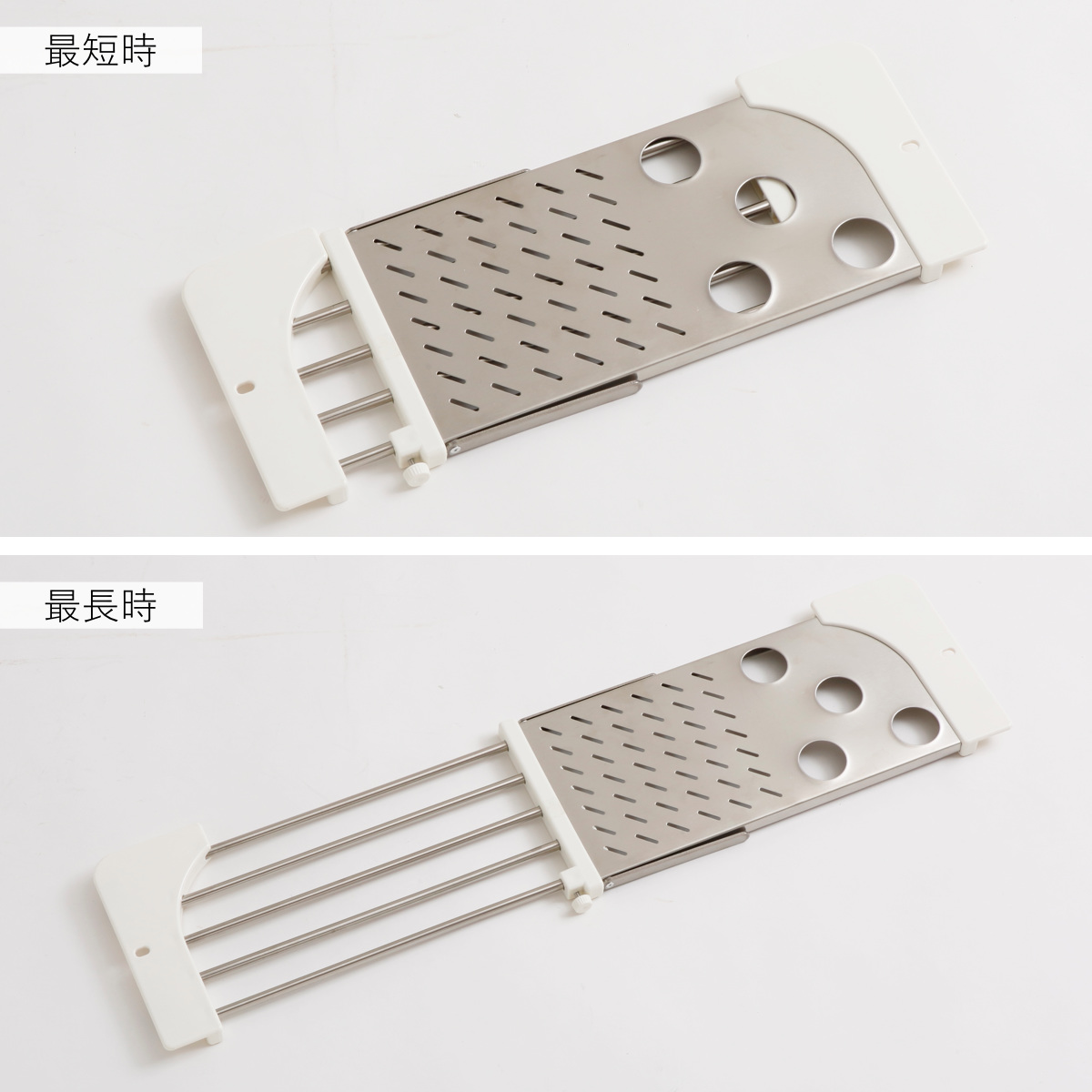 シンクの奥行に合わせて長さ(約39~63cm)を変えられるスライド式です。ペットボトル穴使用時は48~63cmのシンクに対応しています。