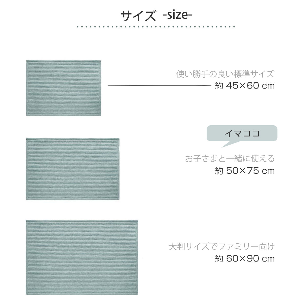![]() 使い勝手のよい標準サイズ | ![]() お子さまと一緒に使える大きめサイズ | ![]() 大判サイズでファミリー向け |