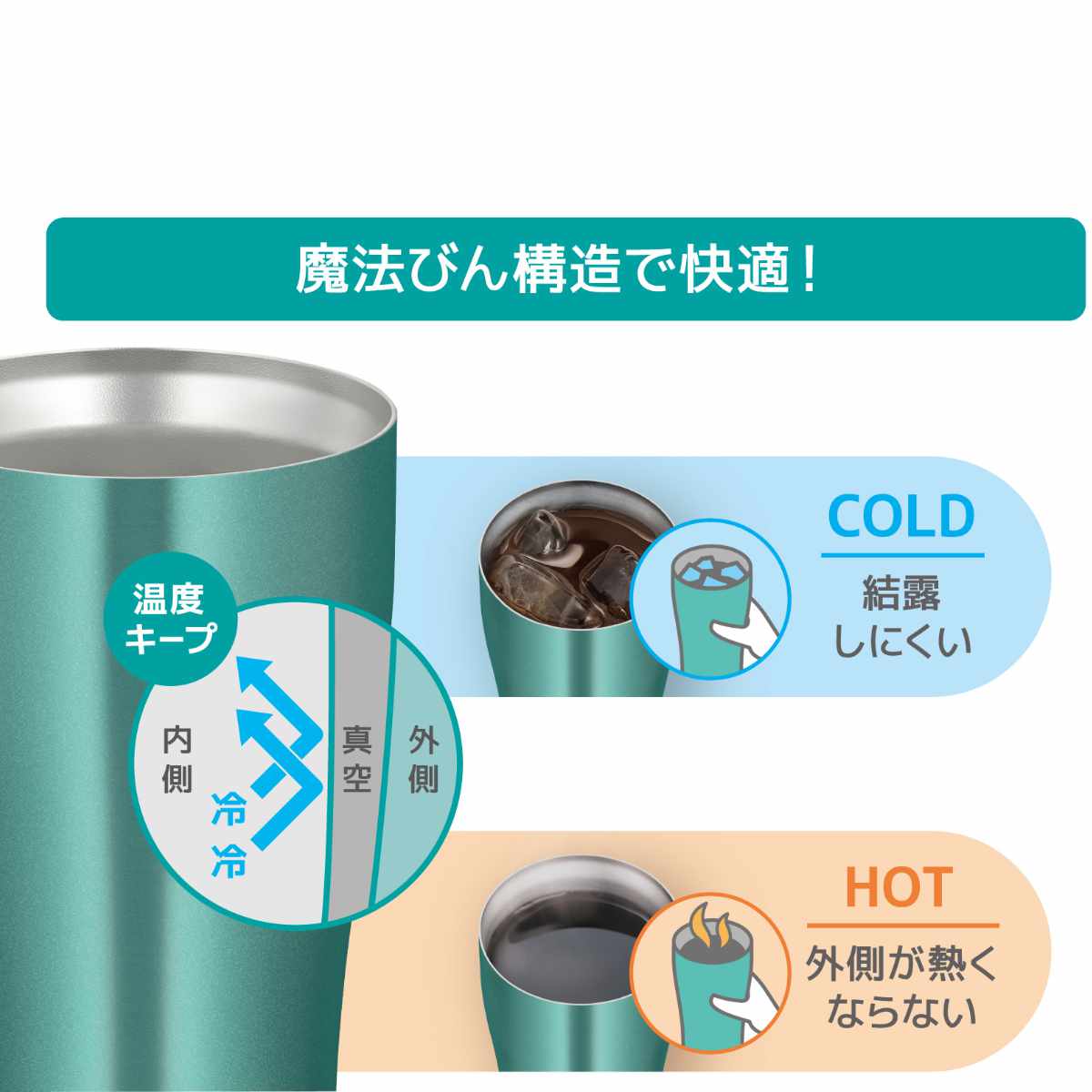 真空断熱の二重構造なので、結露しにくくテーブルを汚しません。また、熱を伝えにくいので熱い飲み物を入れても外側が熱くなりにくく、安心して持つことができます。