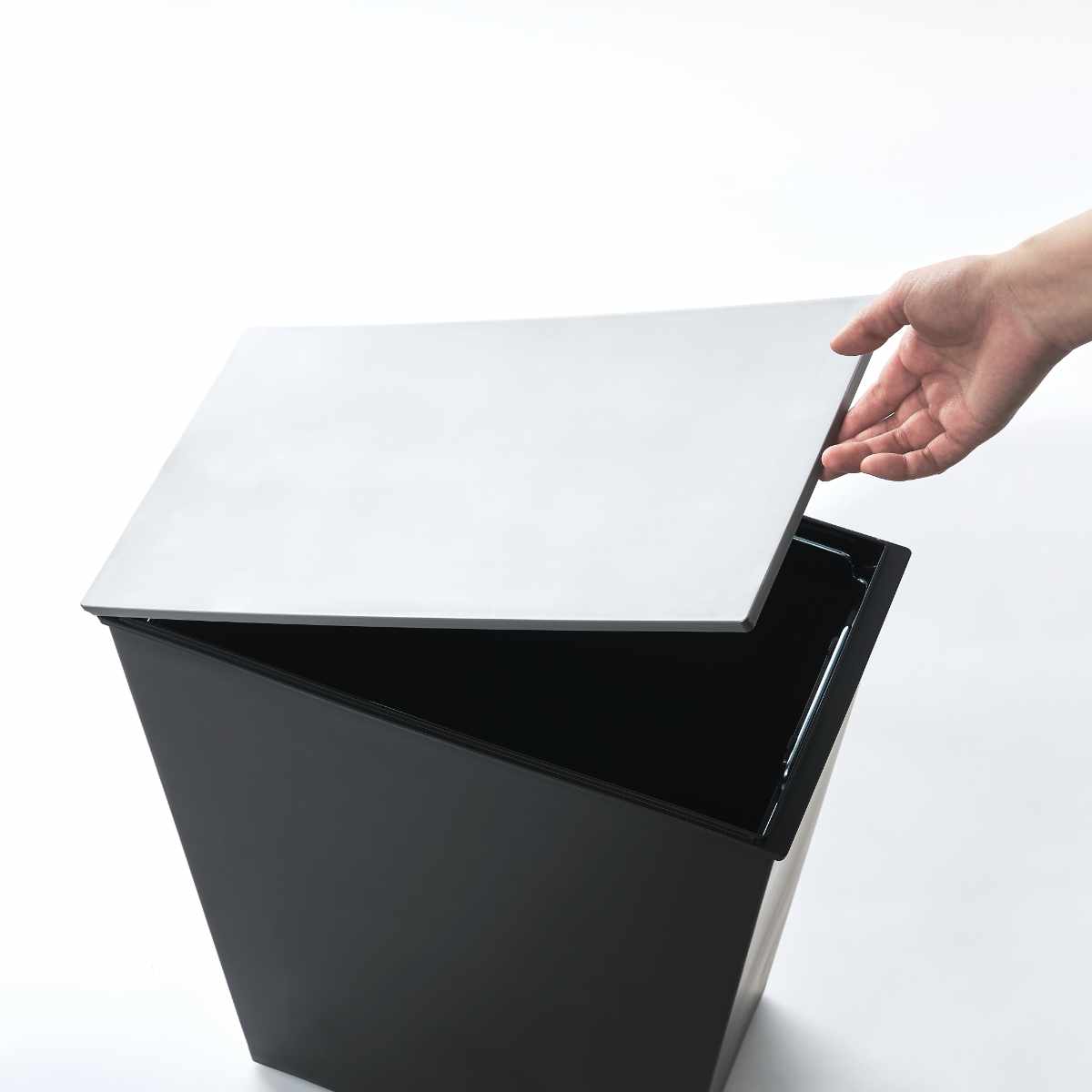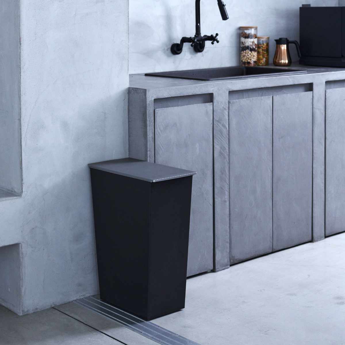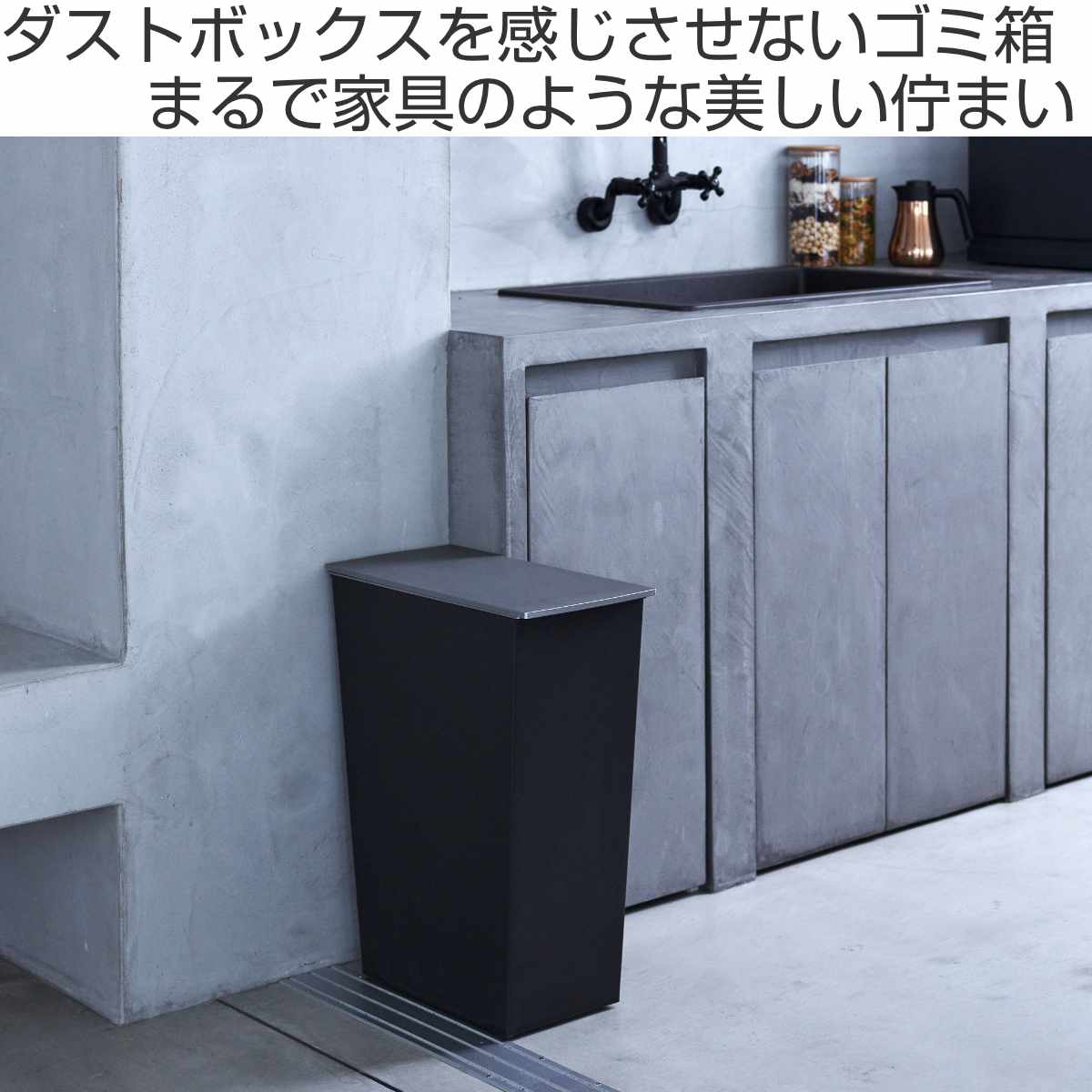 キッチンなどの水回りのステンレスに馴染む、コントラストをつけた2トーンカラーです。本体はブラック、ふたはシャープなシルバーで上質な空間を演出します。
