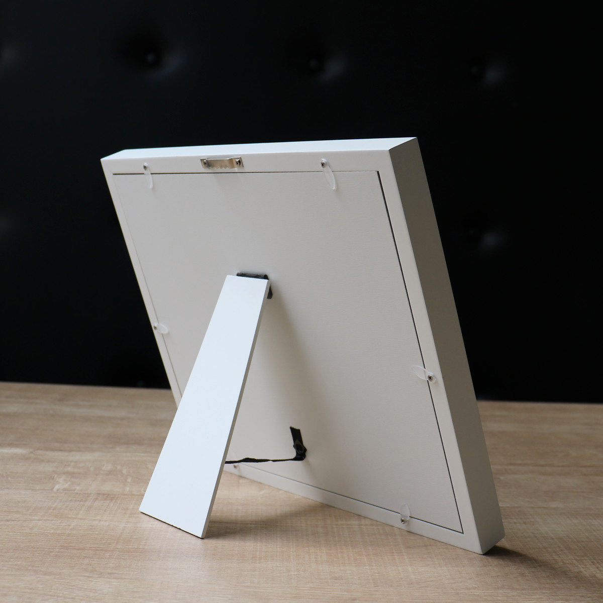 フォトスタンドとして立てて使用する以外に、裏の壁掛けパーツを引っ掛けて、壁面に取り付けることもできます。