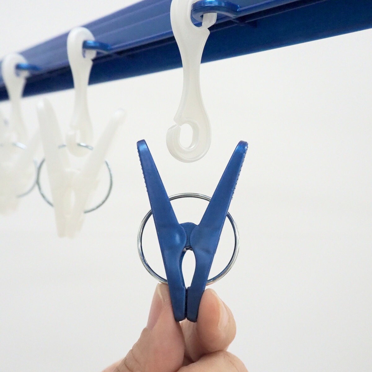 物干し竿や洗濯ロープにしっかり固定できるキャッチ式。風が強い日でも安心して干すことができます。直径25~39mmの竿に対応しているので、ふとん干し用太竿にも使用できます。