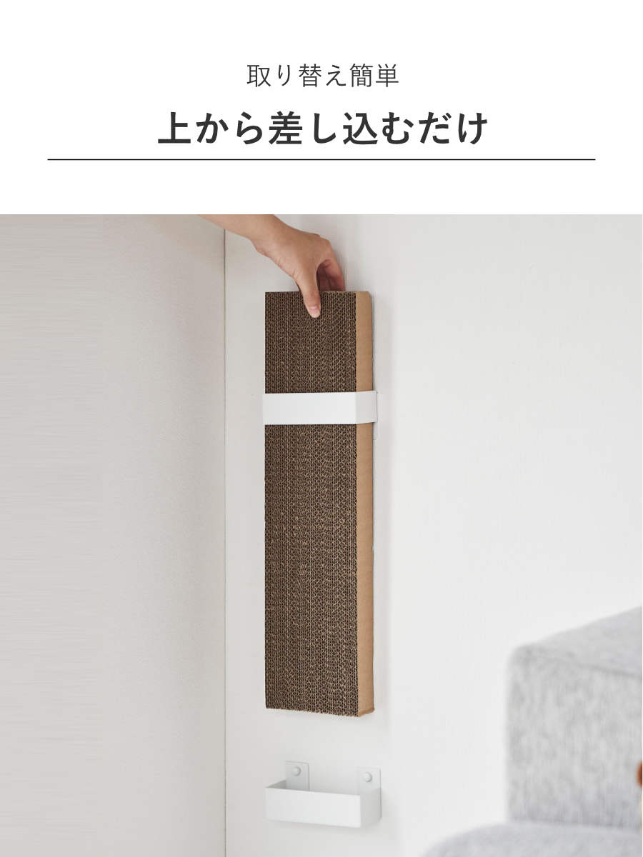 市販の爪とぎ(約幅12×奥行4.5cm以内)に対応しています。上部のフタを開けて、市販の爪とぎを入れるだけで簡単にセッティングできます。下のパーツには爪とぎを固定するピンが付いているので、ズレずにお使いいただけます。