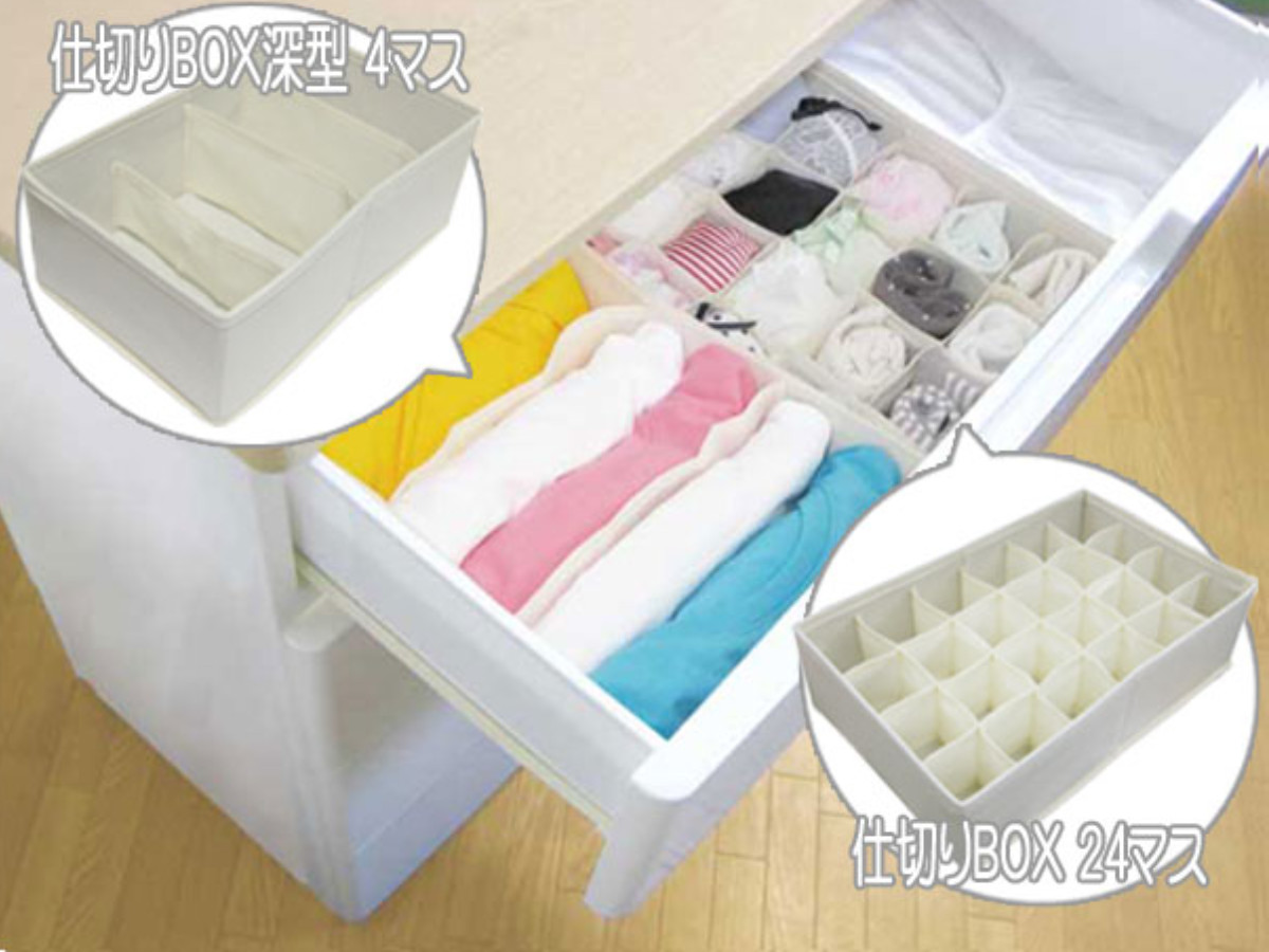 お気に入りのアイテムが一目で見つかり、探す手間が省ける収納ボックスです。24マスに区切る仕切りがついているので、行方不明になりがちな靴下や下着、ストッキングに定位置を作って上手に収納できます。